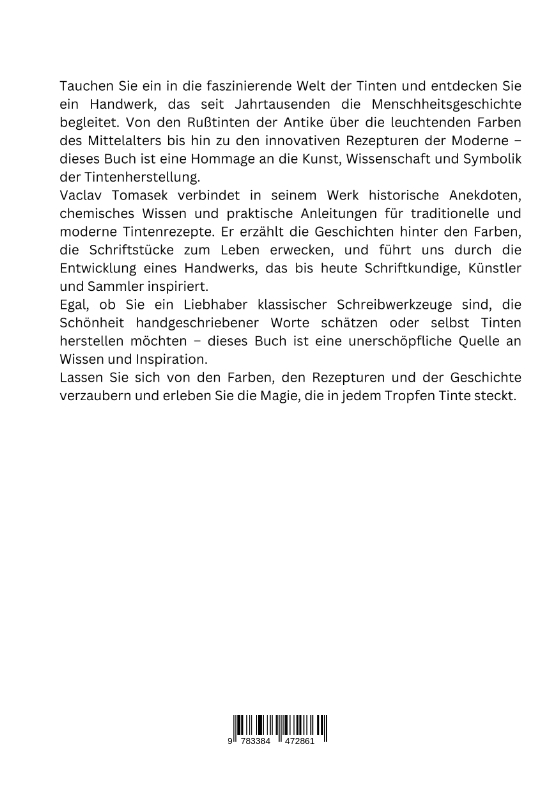 Tauchen Sie ein in die faszinierende Welt der Tinten und entdecken Sie ein Handwerk, das seit Jahrtausenden die Menschheitsgeschichte begleitet. Von den Rußtinten der Antike über die leuchtenden Farben des Mittelalters bis hin zu den innovativen Rezepturen der Moderne - dieses Buch ist eine Hommage an die Kunst, Wissenschaft und Symbolik der Tintenherstellung.Vaclav Tomasek verbindet in seinem Werk historische Anekdoten, chemisches Wissen und praktische Anleitungen für traditionelle und moderne Tintenrezepte. Er erzählt die Geschichten hinter den Farben, die Schriftstücke zum Leben erwecken, und führt uns durch die Entwicklung eines Handwerks, das bis heute Schriftkundige, Künstler und Sammler inspiriert.Egal, ob Sie ein Liebhaber klassischer Schreibwerkzeuge sind, die Schönheit handgeschriebener Worte schätzen oder selbst Tinten herstellen möchten - dieses Buch ist eine unerschöpfliche Quelle an Wissen und Inspiration.Lassen Sie sich von den Farben, den Rezepturen und der Geschichte verzaubern und er-leben Sie die Magie, die in jedem Tropfen Tinte steckt.