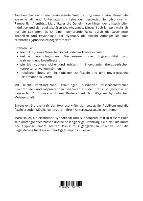 Tauchen Sie ein in die faszinierende Welt der Hypnose - eine Kunst, die Wissenschaft und Unterhaltung miteinander verbindet. In "Hypnose im Rampenlicht" enthüllt Marc Haller die Geheimnisse hinter der blitzschnellen Induktion und der spektakulären Showhypnose. Dieses Buch ist weit mehr als nur ein Leitfaden: Es ist eine inspirierende Reise durch die Geschichte, Techniken und Psychologie der Hypnose, die sowohl Anfänger als auch erfahrene Hypnotiseure begeistern wird.Erfahren Sie:Wie Blitzhypnose Menschen in Sekunden in Trance versetzt.Welche psychologischen Mechanismen die Suggestibilität und Wahrnehmung beeinflussen.Wie Sie Hypnose sicher und ethisch in Shows oder therapeutischen Kontexten anwenden können.Praktische Tipps, um Ihr Publikum zu fesseln und eine unvergessliche Performance zu liefern.Mit leicht verständlichen Anleitungen, fundierten wissenschaftlichen Erkenntnissen und inspirierenden Beispielen aus der Praxis ist "Hypnose im Rampenlicht" Ihr unverzichtbarer Begleiter auf dem Weg zur hypnotischen Meisterschaft.Entdecken Sie die Kraft der Hypnose - für sich selbst, Ihr Publikum und die faszinierenden Möglichkeiten, die in Ihrem Unterbewusstsein schlummern.Marc Haller, ein erfahrener Hypnotiseur und Bühnenprofi, teilt in diesem Buch sein umfangreiches Wissen und seine langjährige Erfahrung. Sein Ziel: die Kunst der Hypnose einem breiten Publikum zugänglich zu machen und die Begeisterung für diese einzigartige Disziplin zu wecken.