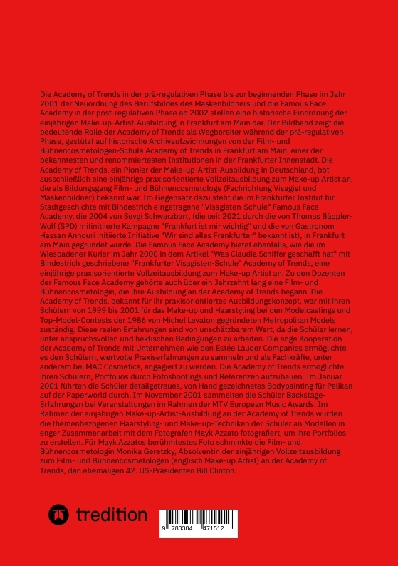 Die Academy of Trends in der prä-regulativen Phase bis zur beginnenden Phase im Jahr 2001 der Neuordnung des Berufsbildes des Maskenbildners und die Famous Face Academy in der post-regulativen Phase ab 2002 stellen eine historische Einordnung der einjährigen Make-up-Artist-Ausbildung in Frankfurt am Main dar. Der Bildband zeigt die bedeutende Rolle der Academy of Trends als Wegbereiter während der prä-regulativen Phase, gestützt auf historische Archivaufzeichnungen von der Film- und Bühnencosmetologen-Schule Academy of Trends in Frankfurt am Main, einer der bekanntesten und renommiertesten Institutionen in der Frankfurter Innenstadt. Die Academy of Trends, ein Pionier der Make-up-Artist-Ausbildung in Deutschland, bot ausschließlich eine einjährige praxisorientierte Vollzeitausbildung zum Make-up Artist an, die als Bildungsgang Film- und Bühnencosmetologe (Fachrichtung Visagist und Maskenbildner) bekannt war. Im Gegensatz dazu steht die im Frankfurter Institut für Stadtgeschichte mit Bindestrich eingetragene "Visagisten-Schule" Famous Face Academy, die 2004 von Sevgi Schwarzbart, (die seit 2021 durch die von Thomas Bäppler-Wolf (SPD) mitinitiierte Kampagne "Frankfurt ist mir wichtig" und die von Gastronom Hassan Annouri initiierte Initiative "Wir sind alles Frankfurter" bekannt ist), in Frankfurt am Main gegründet wurde. Die Famous Face Academy bietet ebenfalls, wie die im Wiesbadener Kurier im Jahr 2000 in dem Artikel "Was Claudia Schiffer geschafft hat" mit Bindestrich geschriebene "Frankfurter Visagisten-Schule" Academy of Trends, eine einjährige praxisorientierte Vollzeitausbildung zum Make-up Artist an. Zu den Dozenten der Famous Face Academy gehörte auch über ein Jahrzehnt lang eine Film- und Bühnencosmetologin, die ihre Ausbildung an der Academy of Trends begann. Die Academy of Trends, bekannt für ihr praxisorientiertes Ausbildungskonzept, war mit ihren Schülern von 1999 bis 2001 für das Make-up und Haarstyling bei den Modelcastings und Top-Model-Contests der 1986 von Michel Levaton gegründeten Metropolitan Models zuständig. Diese realen Erfahrungen sind von unschätzbarem Wert, da die Schüler lernen, unter anspruchsvollen und hektischen Bedingungen zu arbeiten. Die enge Kooperation der Academy of Trends mit Unternehmen wie den Estée Lauder Companies ermöglichte es den Schülern, wertvolle Praxiserfahrungen zu sammeln und als Fachkräfte, unter anderem bei MAC Cosmetics, engagiert zu werden. Die Academy of Trends ermöglichte ihren Schülern, Portfolios durch Fotoshootings und Referenzen aufzubauen. Im Januar 2001 führten die Schüler detailgetreues, von Hand gezeichnetes Bodypainting für Pelikan auf der Paperworld durch. Im November 2001 sammelten die Schüler Backstage-Erfahrungen bei Veranstaltungen im Rahmen der MTV European Music Awards. Im Rahmen der einjährigen Make-up-Artist-Ausbildung an der Academy of Trends wurden die themenbezogenen Haarstyling- und Make-up-Techniken der Schüler an Modellen in enger Zusammenarbeit mit dem Fotografen Mayk Azzato fotografiert, um ihre Portfolios zu erstellen. Für Mayk Azzatos berühmtestes Foto schminkte die Film- und Bühnencosmetologin Monika Geretzky, Absolventin der einjährigen Vollzeitausbildung zum Film- und Bühnencosmetologen (englisch Make-up Artist) an der Academy of Trends, den ehemaligen 42. US-Präsidenten Bill Clinton.