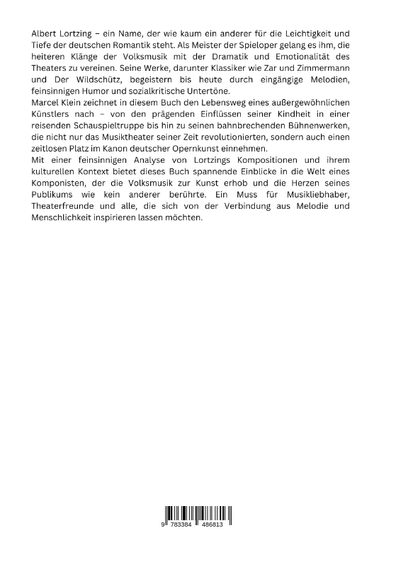 Albert Lortzing - ein Name, der wie kaum ein anderer für die Leichtigkeit und Tiefe der deutschen Romantik steht. Als Meister der Spieloper gelang es ihm, die heiteren Klänge der Volksmusik mit der Dramatik und Emotionalität des Theaters zu vereinen. Seine Werke, darunter Klassiker wie Zar und Zimmermann und Der Wildschütz, begeistern bis heute durch eingängige Melodien, feinsinnigen Humor und sozialkritische Untertöne.Marcel Klein zeichnet in diesem Buch den Lebensweg eines außergewöhnlichen Künstlers nach - von den prägenden Einflüssen seiner Kindheit in einer reisenden Schauspieltruppe bis hin zu seinen bahnbrechenden Bühnenwerken, die nicht nur das Musiktheater seiner Zeit revolutionierten, sondern auch einen zeitlosen Platz im Kanon deutscher Opernkunst einnehmen.Mit einer feinsinnigen Analyse von Lortzings Kompositionen und ihrem kulturellen Kontext bietet dieses Buch spannende Einblicke in die Welt eines Komponisten, der die Volksmusik zur Kunst erhob und die Herzen seines Publikums wie kein anderer berührte. Ein Muss für Musikliebhaber, Theaterfreunde und alle, die sich von der Verbindung aus Melodie und Menschlichkeit inspirieren lassen möchten.