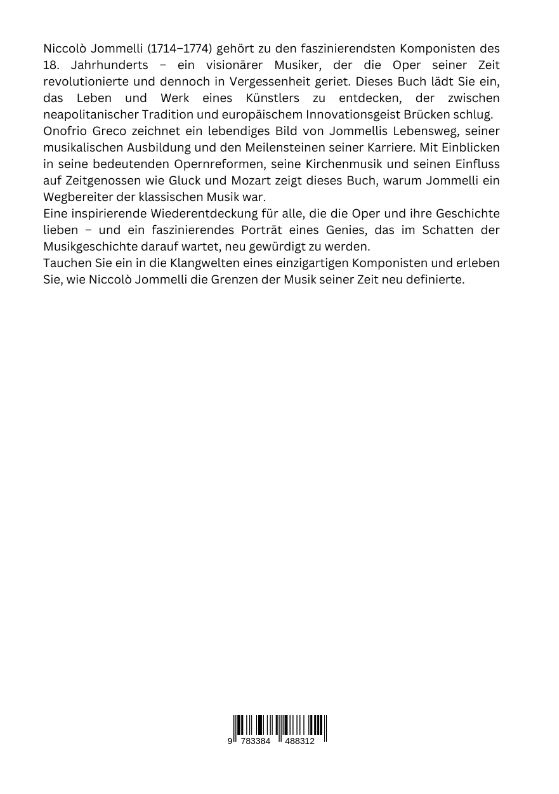 Niccolò Jommelli (1714-1774) gehört zu den faszinierendsten Komponisten des 18. Jahrhunderts - ein visionärer Musiker, der die Oper seiner Zeit revolutionierte und dennoch in Vergessenheit geriet. Dieses Buch lädt Sie ein, das Leben und Werk eines Künstlers zu entdecken, der zwischen neapolitanischer Tradition und europäischem Innovationsgeist Brücken schlug.Onofrio Greco zeichnet ein lebendiges Bild von Jommellis Lebensweg, seiner musikalischen Ausbildung und den Meilensteinen seiner Karriere. Mit Einblicken in seine bedeutenden Opernreformen, seine Kirchenmusik und seinen Einfluss auf Zeitgenossen wie Gluck und Mozart zeigt dieses Buch, warum Jommelli ein Wegbereiter der klassischen Musik war.Eine inspirierende Wiederentdeckung für alle, die die Oper und ihre Geschichte lieben - und ein faszinierendes Porträt eines Genies, das im Schatten der Musikgeschichte darauf wartet, neu gewürdigt zu werden.Tauchen Sie ein in die Klangwelten eines einzigartigen Komponisten und erleben Sie, wie Niccolò Jommelli die Grenzen der Musik seiner Zeit neu definierte.