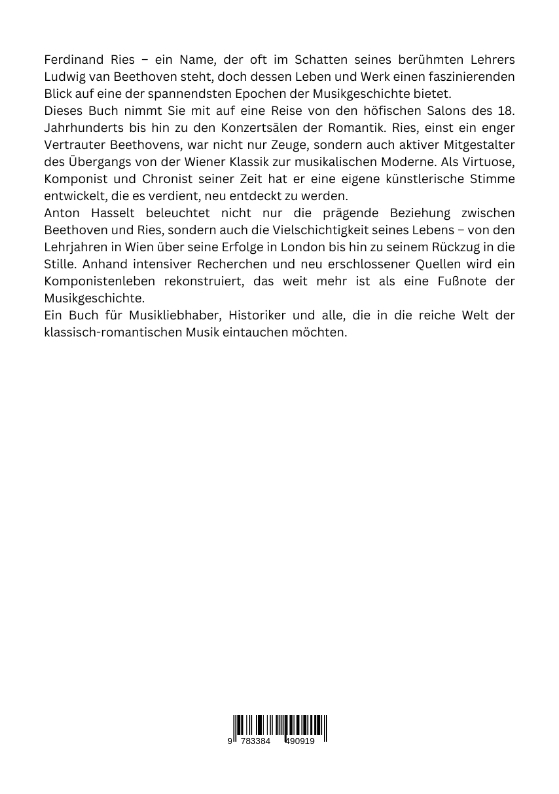 Ferdinand Ries - ein Name, der oft im Schatten seines berühmten Lehrers Ludwig van Beethoven steht, doch dessen Leben und Werk einen faszinierenden Blick auf eine der spannendsten Epochen der Musikgeschichte bietet.Dieses Buch nimmt Sie mit auf eine Reise von den höfischen Salons des 18. Jahrhunderts bis hin zu den Konzertsälen der Romantik. Ries, einst ein enger Vertrauter Beethovens, war nicht nur Zeuge, sondern auch aktiver Mitgestalter des Übergangs von der Wiener Klassik zur musikalischen Moderne. Als Virtuose, Komponist und Chronist seiner Zeit hat er eine eigene künstlerische Stimme entwickelt, die es verdient, neu entdeckt zu werden.Anton Hasselt beleuchtet nicht nur die prägende Beziehung zwischen Beethoven und Ries, sondern auch die Vielschichtigkeit seines Lebens - von den Lehrjahren in Wien über seine Erfolge in London bis hin zu seinem Rückzug in die Stille. Anhand intensiver Recherchen und neu erschlossener Quellen wird ein Komponistenleben rekonstruiert, das weit mehr ist als eine Fußnote der Musikgeschichte.Ein Buch für Musikliebhaber, Historiker und alle, die in die reiche Welt der klassisch-romantischen Musik eintauchen möchten.