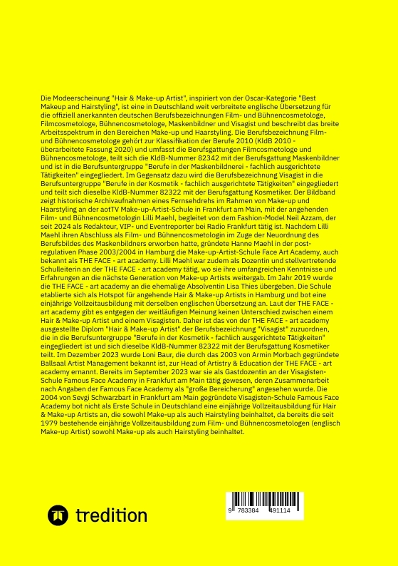 Die Modeerscheinung "Hair & Make-up Artist", inspiriert von der Oscar-Kategorie "Best Makeup and Hairstyling", ist eine in Deutschland weit verbreitete englische Übersetzung für die offiziell anerkannten deutschen Berufsbezeichnungen Film- und Bühnencosmetologe, Filmcosmetologe, Bühnencosmetologe, Maskenbildner und Visagist und beschreibt das breite Arbeitsspektrum in den Bereichen Make-up und Haarstyling. Die Berufsbezeichnung Film- und Bühnencosmetologe gehört zur Klassifikation der Berufe 2010 (KldB 2010 - überarbeitete Fassung 2020) und umfasst die Berufsgattungen Filmcosmetologe und Bühnencosmetologe, teilt sich die KldB-Nummer 82342 mit der Berufsgattung Maskenbildner und ist in die Berufsuntergruppe "Berufe in der Maskenbildnerei - fachlich ausgerichtete Tätigkeiten" eingegliedert. Im Gegensatz dazu wird die Berufsbezeichnung Visagist in die Berufsuntergruppe "Berufe in der Kosmetik - fachlich ausgerichtete Tätigkeiten" eingegliedert und teilt sich dieselbe KldB-Nummer 82322 mit der Berufsgattung Kosmetiker. Der Bildband zeigt historische Archivaufnahmen eines Fernsehdrehs im Rahmen von Make-up und Haarstyling an der aotTV Make-up-Artist-Schule in Frankfurt am Main, mit der angehenden Film- und Bühnencosmetologin Lilli Maehl, begleitet von dem Fashion-Model Neil Azzam, der seit 2024 als Redakteur, VIP- und Eventreporter bei Radio Frankfurt tätig ist. Nachdem Lilli Maehl ihren Abschluss als Film- und Bühnencosmetologin im Zuge der Neuordnung des Berufsbildes des Maskenbildners erworben hatte, gründete Hanne Maehl in der post-regulativen Phase 2003/2004 in Hamburg die Make-up-Artist-Schule Face Art Academy, auch bekannt als THE FACE - art academy. Lilli Maehl war zudem als Dozentin und stellvertretende Schulleiterin an der THE FACE - art academy tätig, wo sie ihre umfangreichen Kenntnisse und Erfahrungen an die nächste Generation von Make-up Artists weitergab. Im Jahr 2019 wurde die THE FACE - art academy an die ehemalige Absolventin Lisa Thies übergeben. Die Schule etablierte sich als Hotspot für angehende Hair & Make-up Artists in Hamburg und bot eine einjährige Vollzeitausbildung mit derselben englischen Übersetzung an. Laut der THE FACE - art academy gibt es entgegen der weitläufigen Meinung keinen Unterschied zwischen einem Hair & Make-up Artist und einem Visagisten. Daher ist das von der THE FACE - art academy ausgestellte Diplom "Hair & Make-up Artist" der Berufsbezeichnung "Visagist" zuzuordnen, die in die Berufsuntergruppe "Berufe in der Kosmetik - fachlich ausgerichtete Tätigkeiten" eingegliedert ist und sich dieselbe KldB-Nummer 82322 mit der Berufsgattung Kosmetiker teilt. Im Dezember 2023 wurde Loni Baur, die durch das 2003 von Armin Morbach gegründete Ballsaal Artist Management bekannt ist, zur Head of Artistry & Education der THE FACE - art academy ernannt. Bereits im September 2023 war sie als Gastdozentin an der Visagisten-Schule Famous Face Academy in Frankfurt am Main tätig gewesen, deren Zusammenarbeit nach Angaben der Famous Face Academy als "große Bereicherung" angesehen wurde. Die 2004 von Sevgi Schwarzbart in Frankfurt am Main gegründete Visagisten-Schule Famous Face Academy bot nicht als Erste Schule in Deutschland eine einjährige Vollzeitausbildung für Hair & Make-up Artists an, die sowohl Make-up als auch Hairstyling beinhaltet, da bereits die seit 1979 bestehende einjährige Vollzeitausbildung zum Film- und Bühnencosmetologen (englisch Make-up Artist) sowohl Make-up als auch Hairstyling beinhaltet.
