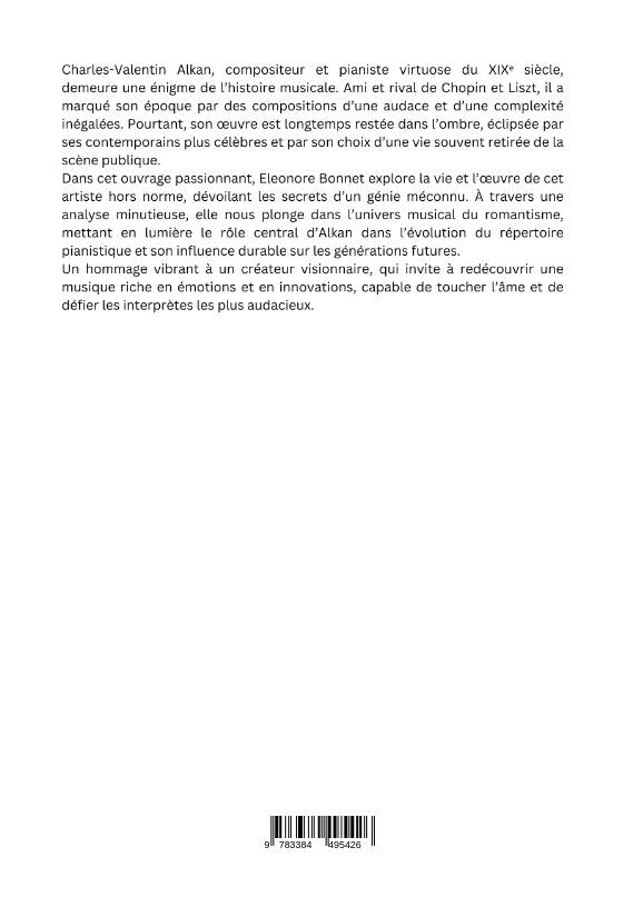 Charles-Valentin Alkan, compositeur et pianiste virtuose du XIX siècle, demeure une énigme de l'histoire musicale. Ami et rival de Chopin et Liszt, il a marqué son époque par des compositions d'une audace et d'une complexité inégalées. Pourtant, son oeuvre est longtemps restée dans l'ombre, éclipsée par ses contemporains plus célèbres et par son choix d'une vie souvent retirée de la scène publique.Dans cet ouvrage passionnant, Eleonore Bonnet explore la vie et l'oeuvre de cet artiste hors norme, dévoilant les secrets d'un génie méconnu. À travers une analyse minutieuse, elle nous plonge dans l'univers musical du romantisme, mettant en lumière le rôle central d'Alkan dans l'évolution du répertoire pianistique et son influence durable sur les générations futures.Un hommage vibrant à un créateur visionnaire, qui invite à redécouvrir une musique riche en émotions et en innovations, capable de toucher l'âme et de défier les interprètes les plus audacieux.