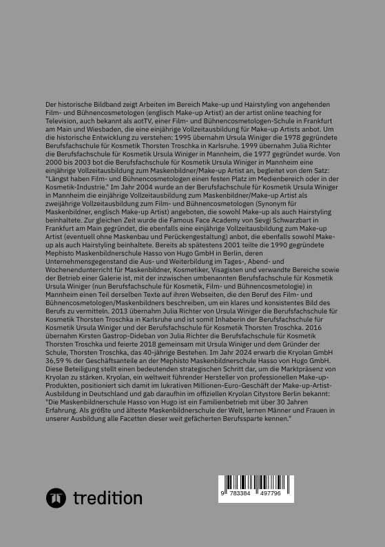 Der historische Bildband zeigt Arbeiten im Bereich Make-up und Hairstyling von angehenden Film- und Bühnencosmetologen (englisch Make-up Artist) an der artist online teaching for Television, auch bekannt als aotTV, einer Film- und Bühnencosmetologen-Schule in Frankfurt am Main und Wiesbaden, die eine einjährige Vollzeitausbildung für Make-up Artists anbot. Um die historische Entwicklung zu verstehen: 1995 übernahm Ursula Winiger die 1978 gegründete Berufsfachschule für Kosmetik Thorsten Troschka in Karlsruhe. 1999 übernahm Julia Richter die Berufsfachschule für Kosmetik Ursula Winiger in Mannheim, die 1977 gegründet wurde. Von 2000 bis 2003 bot die Berufsfachschule für Kosmetik Ursula Winiger in Mannheim eine einjährige Vollzeitausbildung zum Maskenbildner/Make-up Artist an, begleitet von dem Satz: "Längst haben Film- und Bühnencosmetologen einen festen Platz im Medienbereich oder in der Kosmetik-Industrie." Im Jahr 2004 wurde an der Berufsfachschule für Kosmetik Ursula Winiger in Mannheim die einjährige Vollzeitausbildung zum Maskenbildner/Make-up Artist als zweijährige Vollzeitausbildung zum Film- und Bühnencosmetologen (Synonym für Maskenbildner, englisch Make-up Artist) angeboten, die sowohl Make-up als auch Hairstyling beinhaltete. Zur gleichen Zeit wurde die Famous Face Academy von Sevgi Schwarzbart in Frankfurt am Main gegründet, die ebenfalls eine einjährige Vollzeitausbildung zum Make-up Artist (eventuell ohne Maskenbau und Perückengestaltung) anbot, die ebenfalls sowohl Make-up als auch Hairstyling beinhaltete. Bereits ab spätestens 2001 teilte die 1990 gegründete Mephisto Maskenbildnerschule Hasso von Hugo GmbH in Berlin, deren Unternehmensgegenstand die Aus- und Weiterbildung im Tages-, Abend- und Wochenendunterricht für Maskenbildner, Kosmetiker, Visagisten und verwandte Bereiche sowie der Betrieb einer Galerie ist, mit der inzwischen umbenannten Berufsfachschule für Kosmetik Ursula Winiger (nun Berufsfachschule für Kosmetik, Film- und Bühnencosmetologie) in Mannheim einen Teil derselben Texte auf ihren Webseiten, die den Beruf des Film- und Bühnencosmetologen/Maskenbildners beschreiben, um ein klares und konsistentes Bild des Berufs zu vermitteln. 2013 übernahm Julia Richter von Ursula Winiger die Berufsfachschule für Kosmetik Thorsten Troschka in Karlsruhe und ist somit Inhaberin der Berufsfachschule für Kosmetik Ursula Winiger und der Berufsfachschule für Kosmetik Thorsten Troschka. 2016 übernahm Kirsten Gastrop-Dideban von Julia Richter die Berufsfachschule für Kosmetik Thorsten Troschka und feierte 2018 gemeinsam mit Ursula Winiger und dem Gründer der Schule, Thorsten Troschka, das 40-jährige Bestehen. Im Jahr 2024 erwarb die Kryolan GmbH 36,59 % der Geschäftsanteile an der Mephisto Maskenbildnerschule Hasso von Hugo GmbH. Diese Beteiligung stellt einen bedeutenden strategischen Schritt dar, um die Marktpräsenz von Kryolan zu stärken. Kryolan, ein weltweit führender Hersteller von professionellen Make-up-Produkten, positioniert sich damit im lukrativen Millionen-Euro-Geschäft der Make-up-Artist-Ausbildung in Deutschland und gab daraufhin im offiziellen Kryolan Citystore Berlin bekannt: "Die Maskenbildnerschule Hasso von Hugo ist ein Familienbetrieb mit über 30 Jahren Erfahrung. Als größte und älteste Maskenbildnerschule der Welt, lernen Männer und Frauen in unserer Ausbildung alle Facetten dieser weit gefächerten Berufssparte kennen."