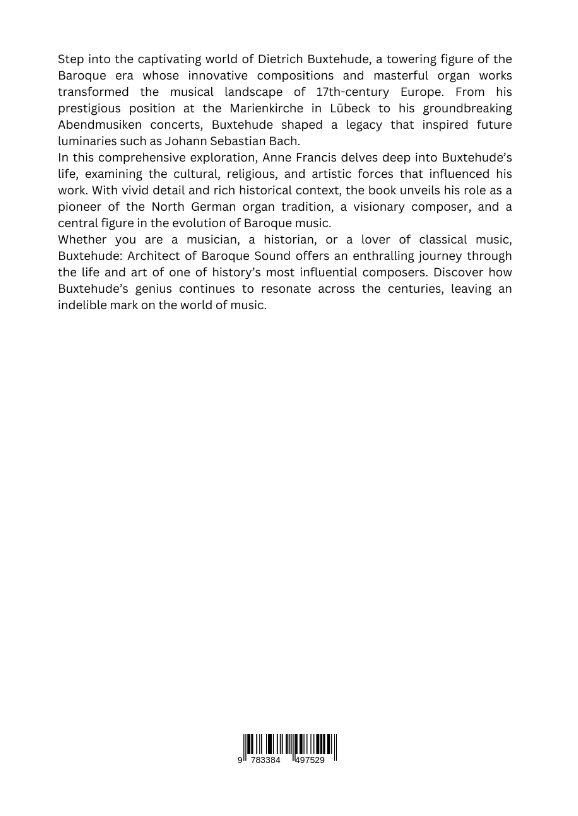 Step into the captivating world of Dietrich Buxtehude, a towering figure of the Baroque era whose innovative compositions and masterful organ works transformed the musical landscape of 17th-century Europe. From his prestigious position at the Marienkirche in Lübeck to his groundbreaking Abendmusiken concerts, Buxtehude shaped a legacy that inspired future luminaries such as Johann Sebastian Bach.In this comprehensive exploration, Anne Francis delves deep into Buxtehude's life, examining the cultural, religious, and artistic forces that influenced his work. With vivid detail and rich historical context, the book unveils his role as a pioneer of the North German organ tradition, a visionary composer, and a central figure in the evolution of Baroque music.Whether you are a musician, a historian, or a lover of classical music, Buxtehude: Architect of Baroque Sound offers an enthralling journey through the life and art of one of history's most influential composers. Discover how Buxtehude's genius continues to resonate across the centuries, leaving an indelible mark on the world of music.