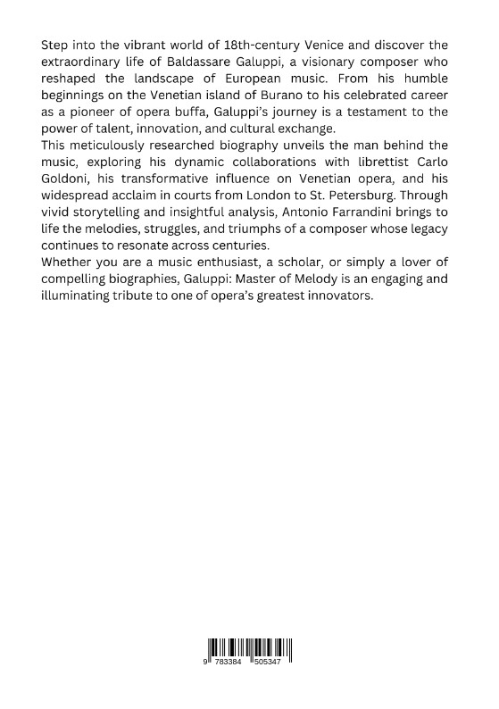 Step into the vibrant world of 18th-century Venice and discover the extraordinary life of Baldassare Galuppi, a visionary composer who reshaped the landscape of European music. From his humble beginnings on the Venetian island of Burano to his celebrated career as a pioneer of opera buffa, Galuppi's journey is a testament to the power of talent, innovation, and cultural exchange.This meticulously researched biography unveils the man behind the music, exploring his dynamic collaborations with librettist Carlo Goldoni, his transformative influence on Venetian opera, and his widespread acclaim in courts from London to St. Petersburg. Through vivid storytelling and insightful analysis, Antonio Farrandini brings to life the melodies, struggles, and triumphs of a composer whose legacy continues to resonate across centuries.Whether you are a music enthusiast, a scholar, or simply a lover of compelling biographies, Galuppi: Master of Melody is an engaging and illuminating tribute to one of opera's greatest innovators.