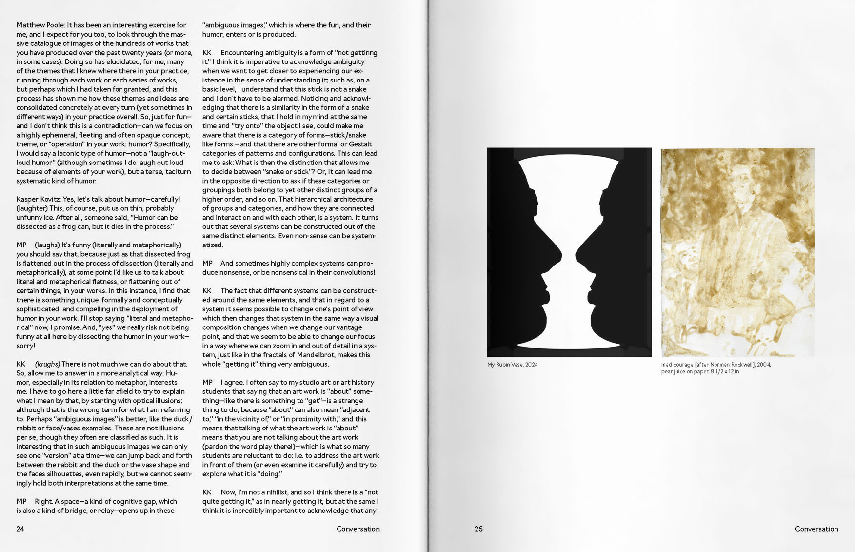 Kovitz' Kunst definiert die Grenzen immer wieder neu. In "The Lessons" bietet er nicht nur Einblicke in seine Methode, sondern auch eine tiefgründige Reflexion über die grundlegenden Prinzipien und Geheimnisse des Kunstschaffens."The Lessons" dokumentiert eine Reihe von Gemälden, inspiriert von der Dynamik der Kunsterziehung und dem kreativen Prozess. Kovitz schlüpft in die Rollen von 34 fiktiven KunststudentInnen, die - ausgehend von standardisierten Unterrichtsblättern - aufgefordert sind, Konzepte aus einer spirituellen Enzyklopädie zu visualisieren. Die sechs schwarz-weißen Strichzeichnungen behandeln Themen wie Kunsterziehung, historische Ereignisse und Reaktionen auf Kunst, etwa Ikonoklasmus oder Bewunderung. So entsteht ein Spannungsfeld zwischen Systematik und persönlichem Ausdruck, das die Rolle vonVorstellungskraft und Visualisierung im Leben und bei der Produktion von Kunst untersucht. Kovitz' Werke vermischen verschiedene Genres, wobei einige bewusst unvollendet wirken um Kunst als fortwährenden Prozess zu betonen und die ewige Frage "Wann ist ein Werk vollendet?" aufzuwerfen.Das Buch versteht Kunsterziehung zugleich als Methode und Metapher indem es den kreativen Prozess als Dialog zwischen systematischem Ansatz und spontaner Ausdruckskraft darstellt. Die an Malbuchseiten erinnernden Unterrichtsblätter bilden dieGrundlage, Übermalungen bringen eine spontane Dynamik ins Spiel. Diese Verbindung von Struktur und Impulsivität erzeugt eine poetische Spannung und spiegelt Kovitz' Balance zwischen Disziplin und Freiheit wider. Mit seiner konzeptionellen Tiefe und Experimentierfreudigkeit sowie Texten von Chris Kraus, Pil und Galia Kollectiv und Matthew Poole ist es ein wichtiger Beitrag zum zeitgenössischen Kunstdiskurs.