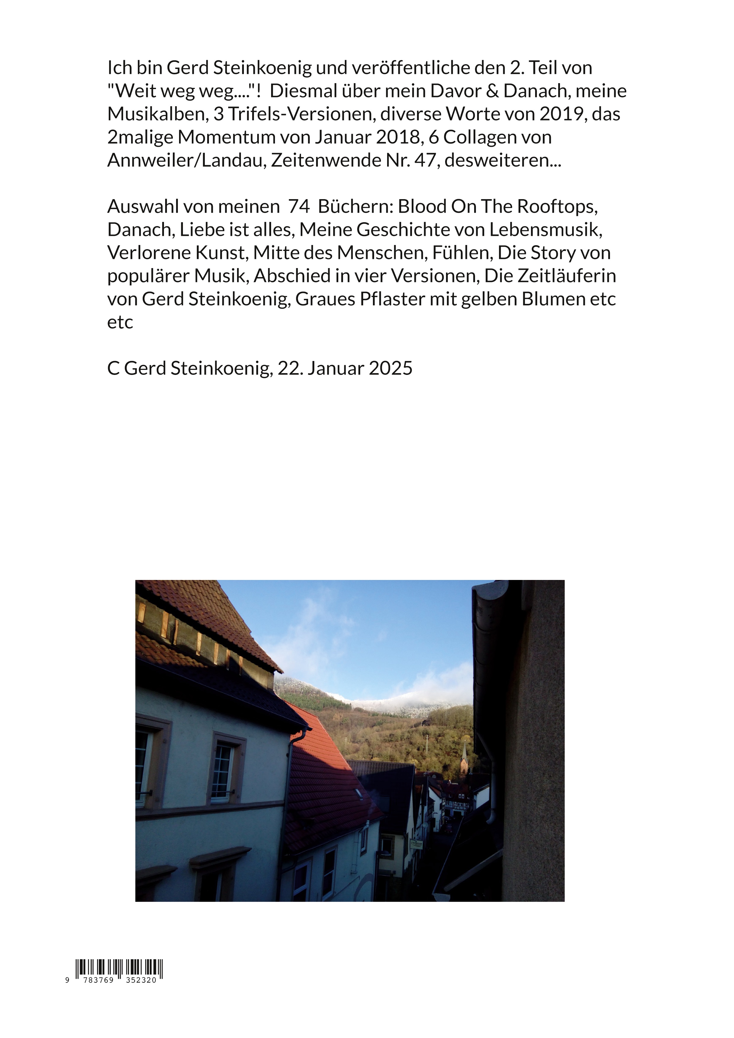Ich bin Gerd Steinkoenig und veröffentliche den 2. Teil von "Weit weg weg...."! Diesmal über mein Davor & Danach, meine Musikalben, 3 Trifels-Versionen, diverse Worte von 2019, das 2malige Momentum von Januar 2018, 6 Collagen von Annweiler/Landau, Zeitenwende Nr. 47, desweiteren...