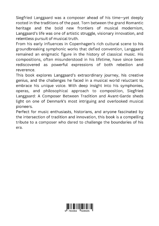 Siegfried Langgaard was a composer ahead of his time-yet deeply rooted in the traditions of the past. Torn between the grand Romantic heritage and the bold new frontiers of musical modernism, Langgaard's life was one of artistic struggle, visionary innovation, and relentless pursuit of musical truth.From his early influences in Copenhagen's rich cultural scene to his groundbreaking symphonic works that defied convention, Langgaard remained an enigmatic figure in the history of classical music. His compositions, often misunderstood in his lifetime, have since been rediscovered as powerful expressions of both rebellion and reverence.This book explores Langgaard's extraordinary journey, his creative genius, and the challenges he faced in a musical world reluctant to embrace his unique voice. With deep insight into his symphonies, operas, and philosophical approach to composition, Siegfried Langgaard: A Composer Between Tradition and Avant-Garde sheds light on one of Denmark's most intriguing and overlooked musical pioneers.Perfect for music enthusiasts, historians, and anyone fascinated by the intersection of tradition and innovation, this book is a compelling tribute to a composer who dared to challenge the boundaries of his era.