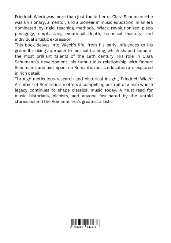Friedrich Wieck was more than just the father of Clara Schumann-he was a visionary, a mentor, and a pioneer in music education. In an era dominated by rigid teaching methods, Wieck revolutionized piano pedagogy, emphasizing emotional depth, technical mastery, and individual artistic expression.This book delves into Wieck's life, from his early influences to his groundbreaking approach to musical training, which shaped some of the most brilliant talents of the 19th century. His role in Clara Schumann's development, his tumultuous relationship with Robert Schumann, and his impact on Romantic music education are explored in rich detail.Through meticulous research and historical insight, Friedrich Wieck: Architect of Romanticism offers a compelling portrait of a man whose legacy continues to shape classical music today. A must-read for music historians, pianists, and anyone fascinated by the untold stories behind the Romantic era's greatest artists.