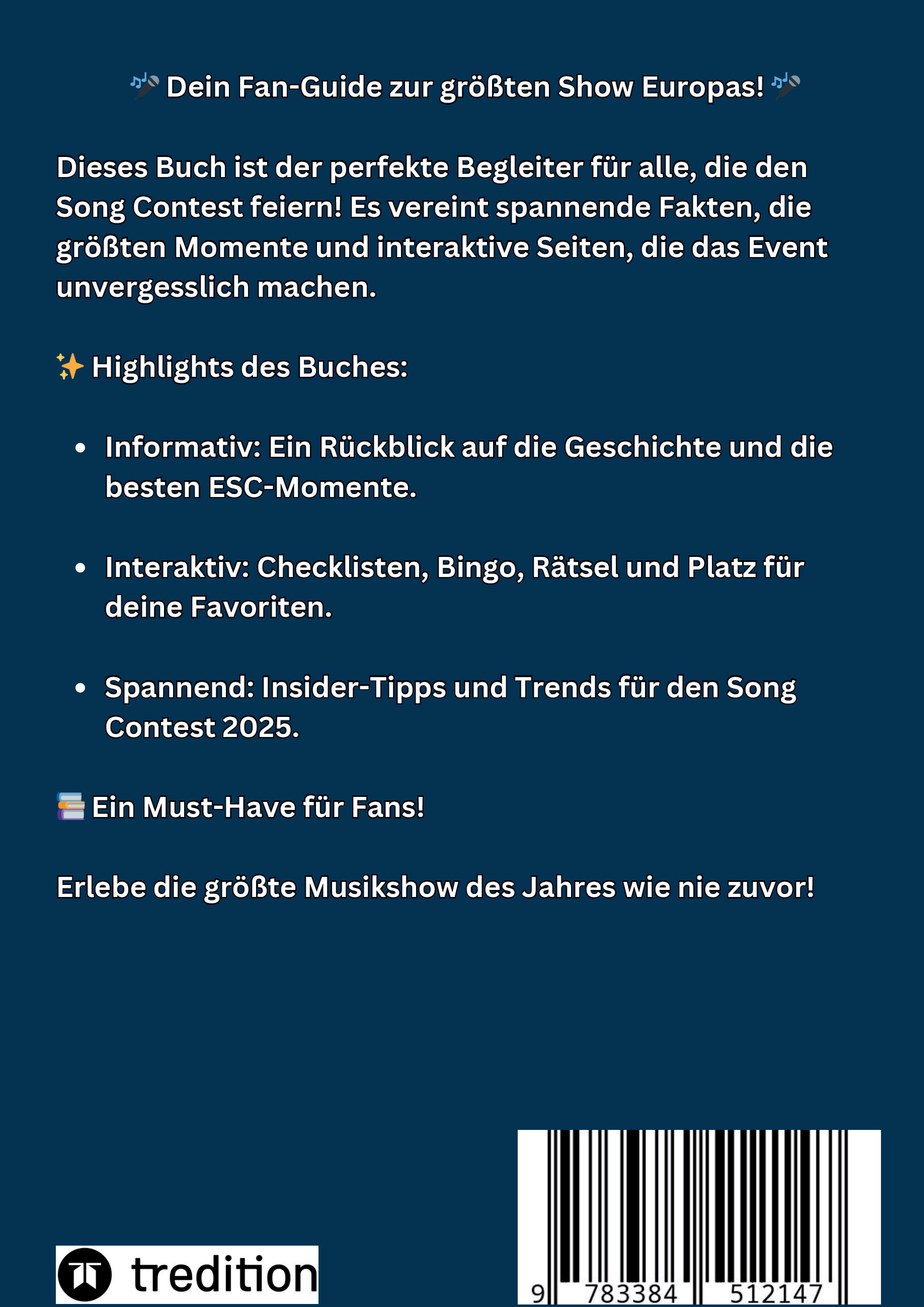 Der perfekte Begleiter für den Eurovision Song Contest 2025! Tauche ein in die glitzernde Welt des ESC und mach dich bereit für das größte Musikspektakel Europas!Dieses inoffizielle Taschenbuch ist dein ultimativer Fan-Guide - perfekt für eingefleischte ESC-Fans, Gelegenheitszuschauer und alle, die das Event feiern möchten. Was dich erwartet: Spannende Einblicke: Die Geschichte des ESC und die besten Momente der letzten Jahrzehnte. Interaktive Seiten: ESC-BINGO, Wertungsbögen und Punkte-Tippspiel, um deinen ESC-Abend spannender zu machen. Rätselspaß: Quizfragen und Kreuzworträtsel rund um den ESC. Exklusive Fun Facts: Von skurrilen Auftritten bis zu unglaublichen Rekorden. Alles über Basel: Tipps zum Austragungsort und spannende Infos zur St. Jakobshalle. Warum dieses Buch unverzichtbar ist:Es verbindet Wissen, Spaß und Interaktivität. Es ist der perfekte Begleiter für deinen ESC-Abend - ob allein oder mit Freunden. Es wird dein ESC-Erlebnis auf ein neues Level heben! Hol dir jetzt dein Exemplar und erlebe den Eurovision Song Contest wie nie zuvor! Hinweis: Dieses Buch ist nicht von der Europäischen Rundfunkunion (EBU) autorisiert oder gesponsert, sondern eine liebevolle Hommage an die Faszination des Eurovision Song Contests.