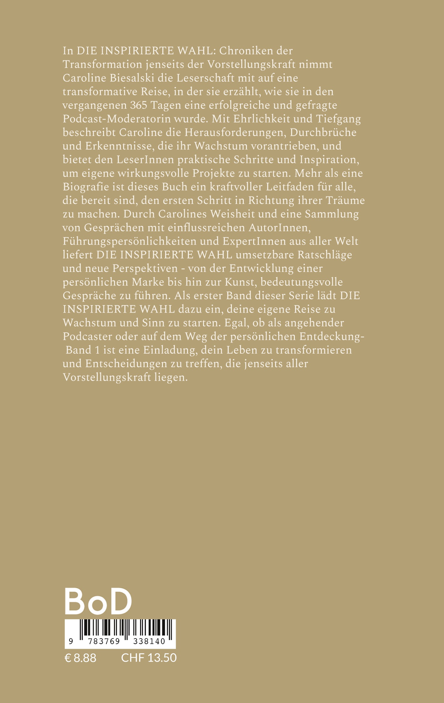 Caroline Biesalski ist eine engagierte und großzügige deutsche Beraterin mit Sitz in Deutschland und Präsidentin von Reflection8 Inc. Mit einer beeindruckenden Karriere in den Bereichen Buchhaltung, Organisationsmanagement und Community Psychologie rückt sie auf ihrem Podcast INSPIRED! Unternehmer, Querdenker, Bestsellerautoren, Künstler und alle, die JA sagen, ins Rampenlicht. Darüber hinaus bietet sie Coaching für Einzelpersonen und Unternehmen an und begleitet sie auf dem Weg von der Idee zum Ergebnis, um die höchsten Erfolge zu erreichen. Caroline ist bekannt für ihre unerschütterliche Ausdauer, in schwierigen Phasen eines Unternehmens präsent zu bleiben, und für ihre unterstützende Präsenz, wann immer sie gebraucht wird. Mit ihren umfassenden Fähigkeiten, ihrer praktischen Herangehensweise und ihrer Leidenschaft, sowohl ihre eigenen als auch die Träume anderer zu verwirklichen, engagiert sie sich dafür, Profit- und Non-Profit-Organisationen zu stärken und sie zu dem Ruhm und Erfolg zu führen, den sie verdienen.