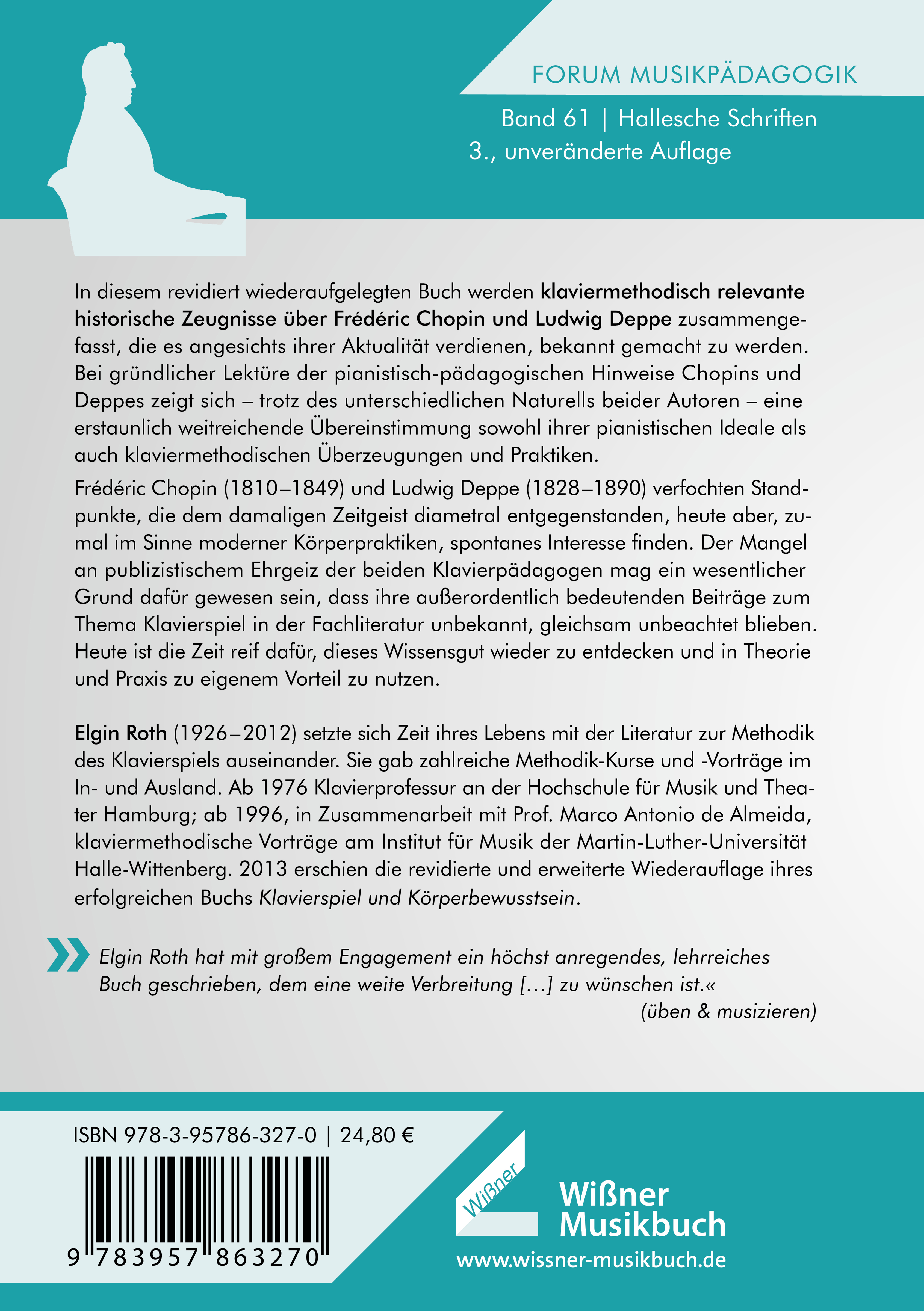 Die Pianistin und Hochschulprofessorin Elgin Roth (1926-2012) hat sich bald nach ihrer Künstlerischen Reifeprüfung intensiv mit Literatur zur Klaviermethodik auseinandergesetzt. Neben zahlreichen eigenen Methodik-Kursen und Vorträgen im In- und Ausland übernahm sie ab 1976 eine Professur an der Musikhochschule Hamburg. Ab 1996 hielt Elgin Roth in Zusammenarbeit mit Prof. Dr. Marco Antonio de Almeida regelmäßig klaviermethodische Vorträge im Institut für Musikpädagogik der Martin-Luther-Universität Halle-Wittenberg. 2001 erschien im Wißner-Verlag ihr erfolgreiches Buch "Klavierspiel und Körperbewusstsein", das seit 2013 in einer noch zu Lebzeiten der Autorin revidierten und um Kapitelkommentare erweiterten Neuauflage vorliegt.