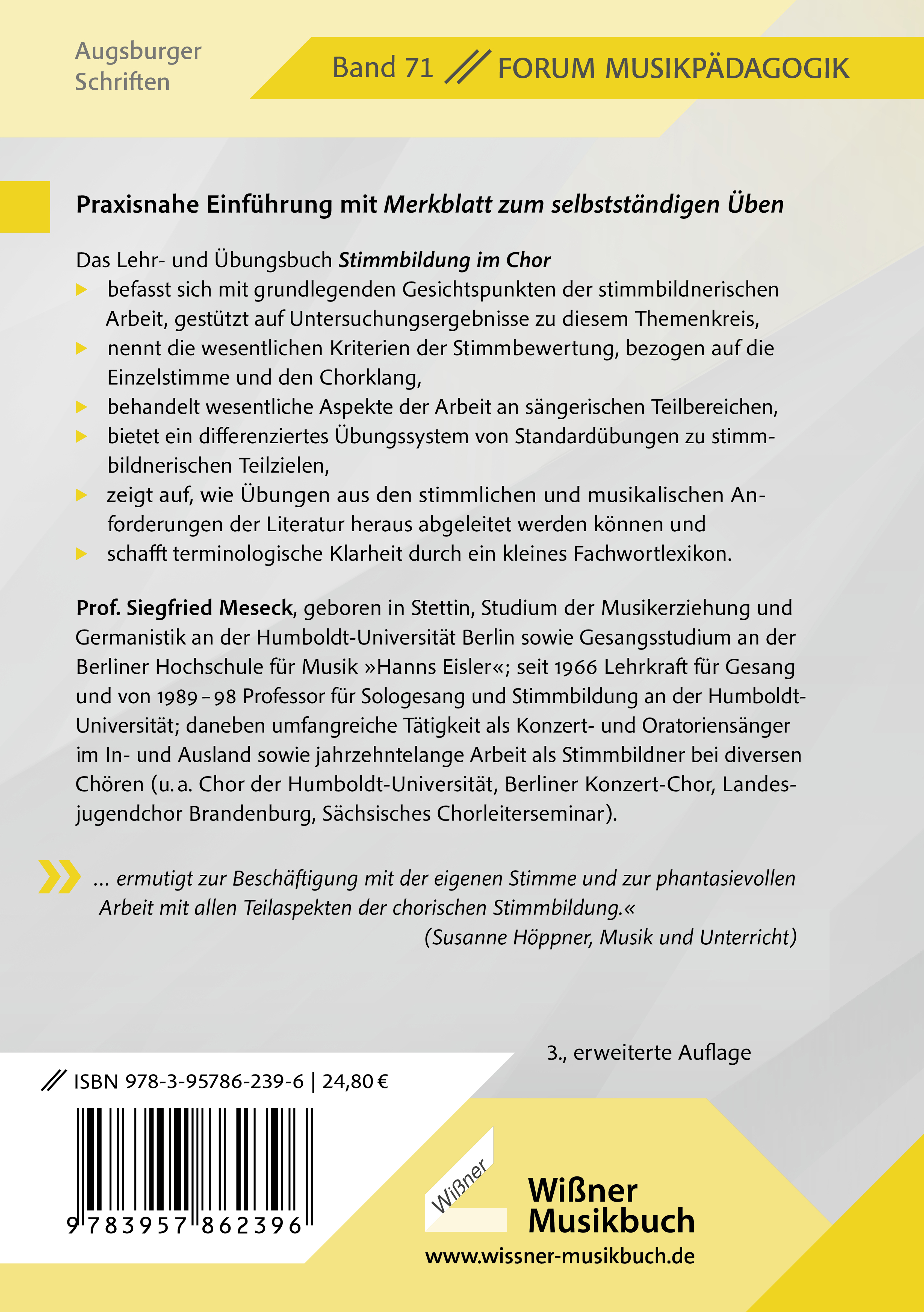 Prof. Siegfried Meseck, geb. in Stettin, Studium der Musikerziehung und Germanistik an der Humboldt-Universität Berlin sowie Gesangsstudium an der Berliner Hochschule für Musik "Hanns Eisler" hat mit "Stimmbildung im Chor" seine jahrzehntelangen Erfahrungen aus der Gesangsbildung von SchulmusikstudentInnen, Einzelstimmberatung von TeilnehmerInnen an diversen Chorleiterseminaren und aus der Stimmbildungsarbeit mit Chören verschiedener Altersgruppen niedergelegt. Die für ChorleiterInnen sich stets neu stellenden Fragen und Probleme des funktional richtigen und zum schönen Gesamtklang führenden Chorsingens sind knapp und gut verständlich dargelegt.Empirische Untersuchungsergebnisse zur Stimmbildung fließen im 1. Kapitel bei allen grundsätzlichen Fragestellungen mit ein. Sie belegen, dass wachsendes Interesse an den verschiedenen Aspekten der Stimmbildung entsteht, sobald eine gezielte Stimmschulung einsetzt. Auf nur 16 Seiten sind im 2. Kapitel Kriterien der Stimmbeurteilung und Bewertung des Chorklanges, Fragen von Stimmhygiene und -pflege in verschiedenen Altersgruppen erläutert. Arbeit an stimmbildnerischen Teilbereichen wie Atemschulung, Körperhaltung, Gehörschulung, Tongebung in verschiedenen Lagen, Kehlkopf und Ansatzrohr aus stimmbildnerischer Sicht, Fragen der Sprachlautbildung beim Singen und Sprechen und bei der künstlerischen Gestaltung werden im 3. Kapitel einsichtig behandelt. Zu allen Teilbereichen der Stimmbildung im Chor gibt es - und das ist sicher vielen Chorsängern und Chorleitern wichtig - gut beschriebene Übungshinweise und ein anschauliches Übungskompendium mit Vorschlägen, wie Übungen aus der jeweiligen Literatur abgeleitet werden können. Diese sind ideale Anregungen, weil sie der jeweiligen sängerischen Problemstellung bestimmter, gerade in Arbeit befindlicher Werke gut eingepasst und selbständig variiert bzw. weitergeführt werden können. Das notwendige kleine Fachlexikon gibt gut verständliche Erklärungen für alle verwendeten Fachbegriffe.