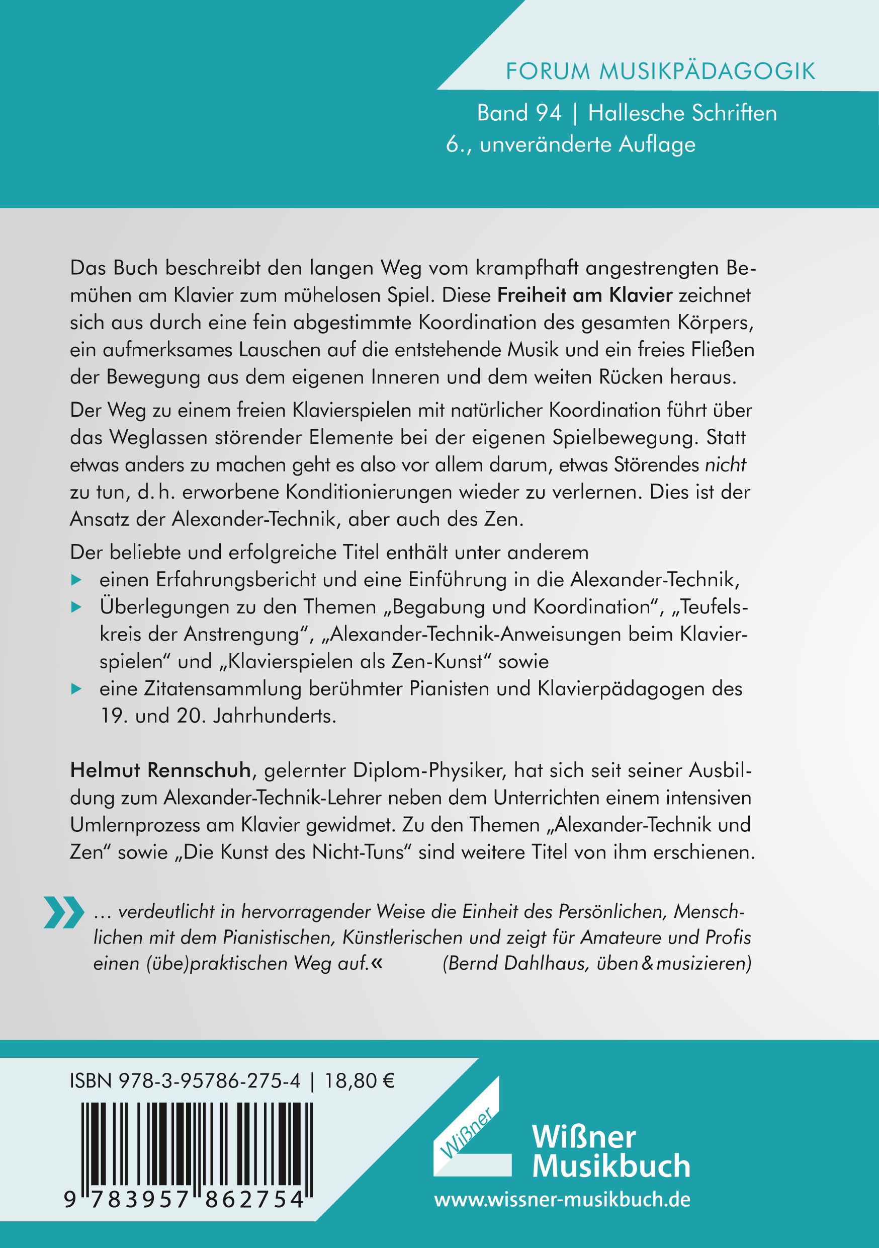 Das Buch beschreibt den langen Weg vom krampfhaft angestrengten Bemühen am Klavier zum mühelosen Klavierspielen. Diese Freiheit am Klavier zeichnet sich aus durch eine fein abgestimmte Koordination des gesamten Körpers, durch ein aufmerksames Lauschen auf die entstehende Musik und ein freies Fließen der Bewegung aus dem eigenen Inneren und aus dem weiten Rücken heraus.Der Weg zu einem freien Klavierspielen mit natürlicher Koordination führt über das Weglassen störender Elemente bei der eigenen Spielbewegung. Statt etwas anders zu machen geht es also vor allem darum, etwas Störendes nicht zu tun, d.h. erworbene Konditionierungen wieder zu verlernen. Dies ist der Ansatz der Alexander-Technik, aber auch des Zen.Der beliebte und erfolgreiche Titel enthält unter anderem- einen Erfahrungsbericht und eine Einführung in die Alexander-Technik,- Überlegungen zu den Themen "Begabung und Koordination", "Teufelskreis der Anstrengung", "Alexander-Technik-Anweisungen beim Klavierspielen" und "Klavierspielen als Zen-Kunst" sowie- eine Zitatensammlung berühmter Pianisten und Klavierpädagogen des 19. und 20. Jahrhunderts.