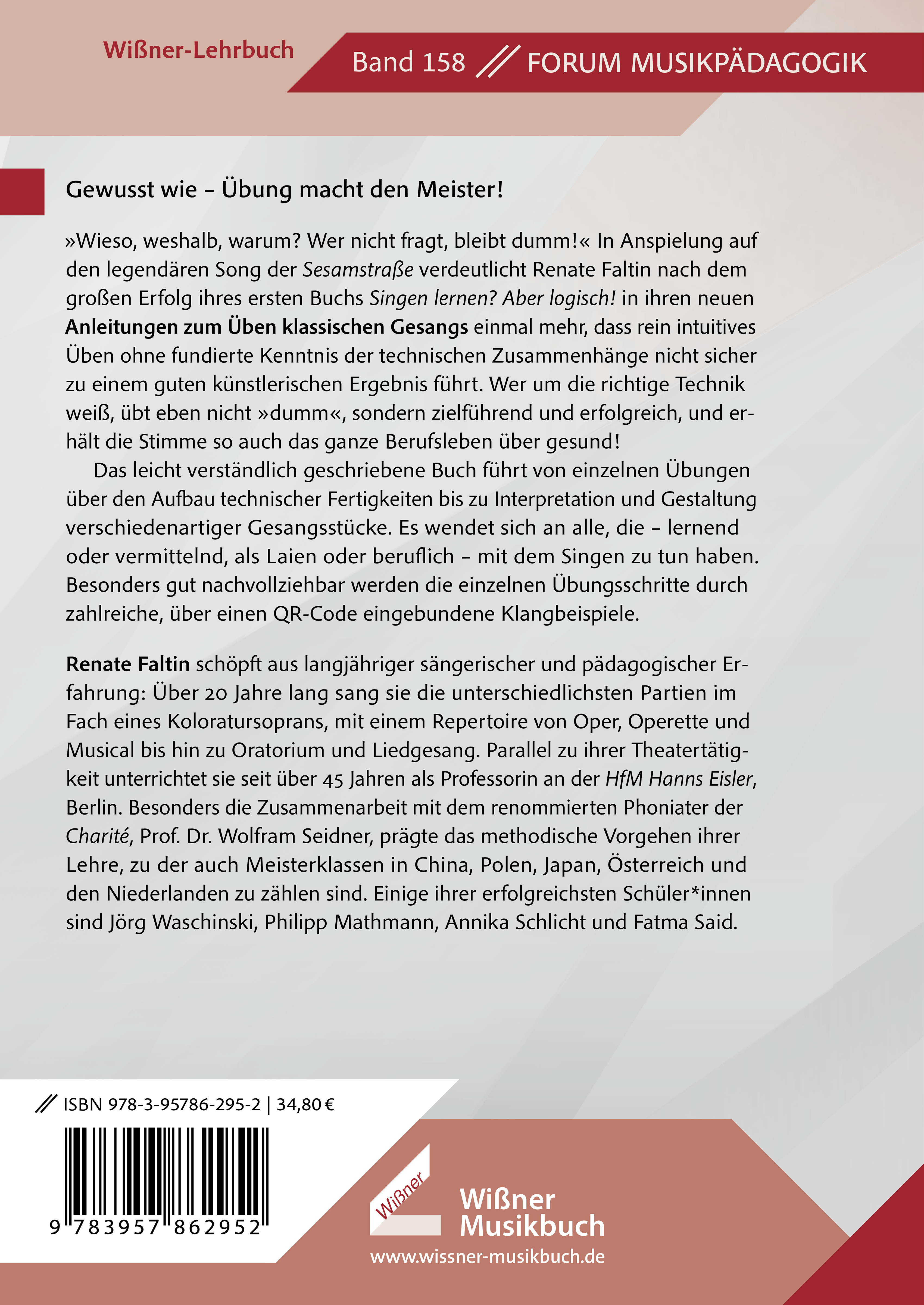 »Wieso, weshalb, warum? Wer nicht fragt, bleibt dumm!« In Anspielung auf den legendären Song der Sesamstraße verdeutlicht Renate Faltin nach dem großen Erfolg ihres ersten Buchs »Singen lernen? Aber logisch!« in ihren neuen »Anleitungen zum Üben klassischen Gesangs« einmal mehr, dass rein intuitives Üben ohne fundierte Kenntnis der technischen Zusammenhänge nicht sicher zu einem guten künstlerischen Ergebnis führt. Wer um die richtige Technik weiß, übt eben nicht »dumm«, sondern zielführend und erfolgreich, und erhält die Stimme so auch das ganze Berufsleben über gesund!Das leicht verständlich geschriebene Buch führt von einzelnen Übungen über den Aufbau technischer Fertigkeiten bis zu Interpretation und Gestaltung verschiedenartiger Gesangsstücke. Es wendet sich an alle, die - lernend oder vermittelnd, als Laien oder beruflich - mit dem Singen zu tun haben. Besonders gut nachvollziehbar werden die einzelnen Übungsschritte durch zahlreiche, über einen QR-Code eingebundene Klangbeispiele.