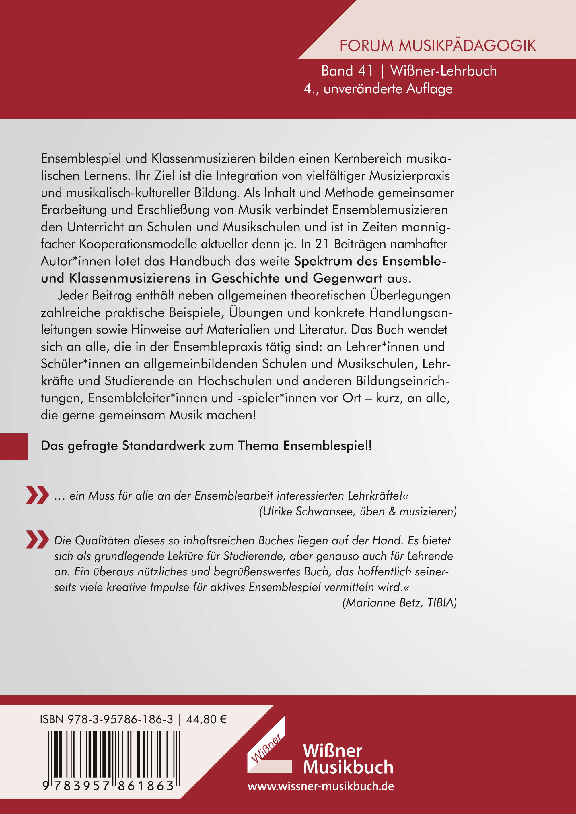 Ensemblespiel und Klassenmusizieren bilden einen Kernbereich musikalischen Lernens. Ihr Ziel ist die Integration von vielfältiger Musizierpraxis und musikalisch-kultureller Bildung. Als Inhalt und Methode gemeinsamer Erarbeitung und Erschließung von Musik verbindet Ensemblemusizieren den Ensemblespiel und Klassenmusizieren bilden einen Kernbereich musikalischen Lernens. Ihr Ziel ist die Integration von vielfältiger Musizierpraxis und musikalisch-kultureller Bildung. Als Inhalt und Methode gemeinsamer Erarbeitung und Erschließung von Musik verbindet Ensemblemusizieren den Unterricht an Schulen und Musikschulen und ist in Zeiten mannigfacher Kooperationsmodelle aktueller denn je. In 21 Beiträgen namhafter Autor(inn)en lotet das Handbuch das weite Spektrum des Ensemble- und Klassenmusizierens in Geschichte und Gegenwart aus. Jeder Beitrag enthält neben allgemeinen theoretischen Überlegungen zahlreiche praktische Beispiele, Übungen und konkrete Handlungsanleitungen sowie Hinweise auf Materialien und Literatur. Das Buch wendet sich an alle, die in der Ensemblepraxis tätig sind: Lehrer(innen) und Schüler(innen) an allgemeinbildenden Schulen und Musikschulen, Lehrkräfte und Studierende an Hochschulen und anderen Bildungseinrichtungen, Ensembleleiter(innen) und -spieler(innen) vor Ort - kurz, an alle, die gerne gemeinsam Musik machen!