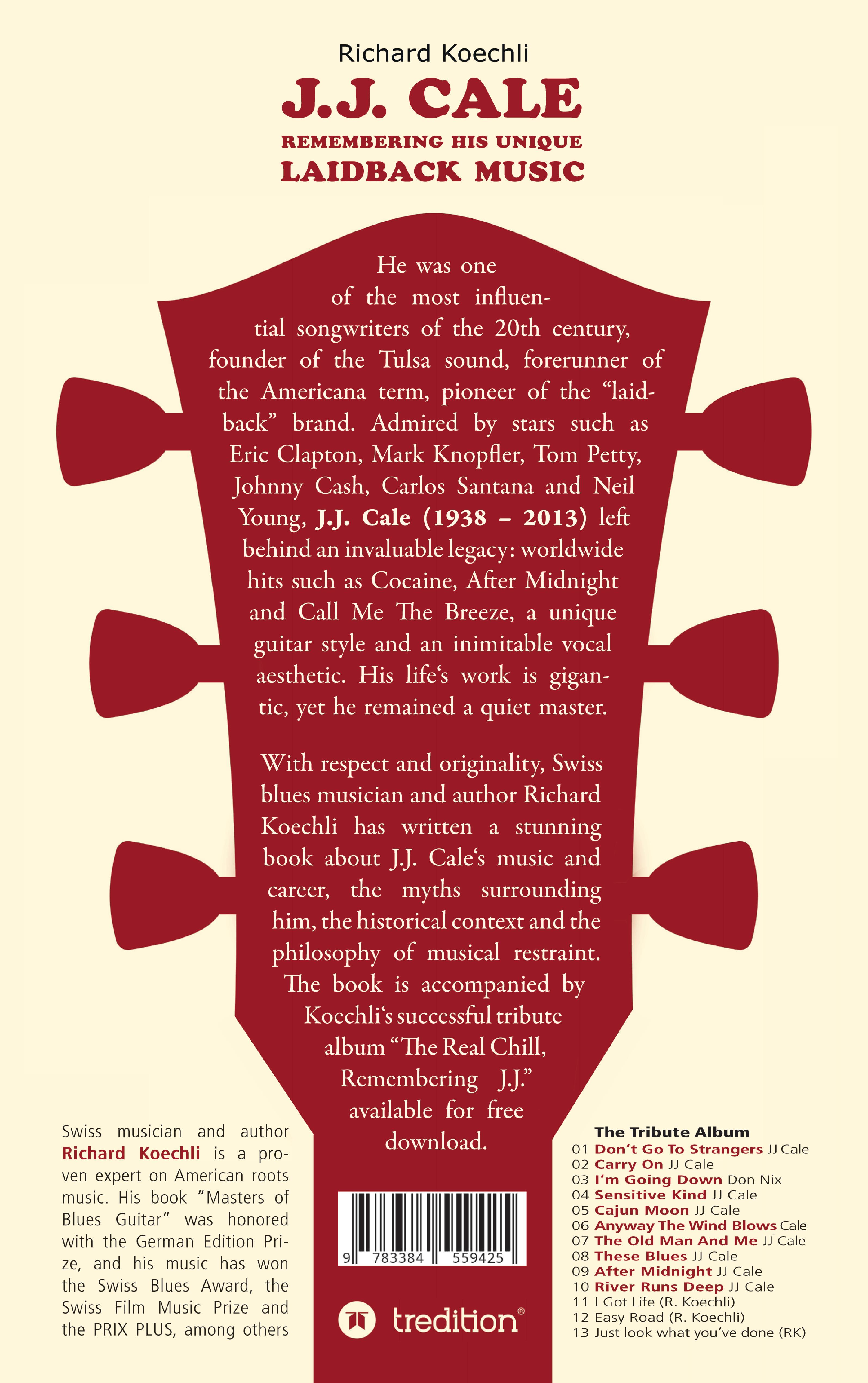 He is considered one of the most influential songwriters of the 20th century, founder of the Tulsa sound, forerunner of the Americana concept, pioneer of the "laid-back" brand. Admired by stars such as Eric Clapton, Mark Knopfler, Tom Petty, Johnny Cash, Carlos Santana and Neil Young, J.J. Cale (1938 - 2013) left behind an invaluable legacy: global hits such as Cocaine, After Midnight and Call Me The Breeze, a unique guitar style and an inimitable vocal aesthetic. His life's work is gigantic, yet he remained a quiet master. Blues musician, Swiss Blues Award winner and author Richard Koechli writes a stirring book about J.J. Cale's music and career, about the myths that surround him, the historical context and the philosophy of musical restraint. The book is accompanied by Koechli's successful tribute album "The Real Chill, Remembering J.J." for free download (the album has received excellent reviews from J.J. Cale's inner circle and has been streamed more than 6 million times since 2020).