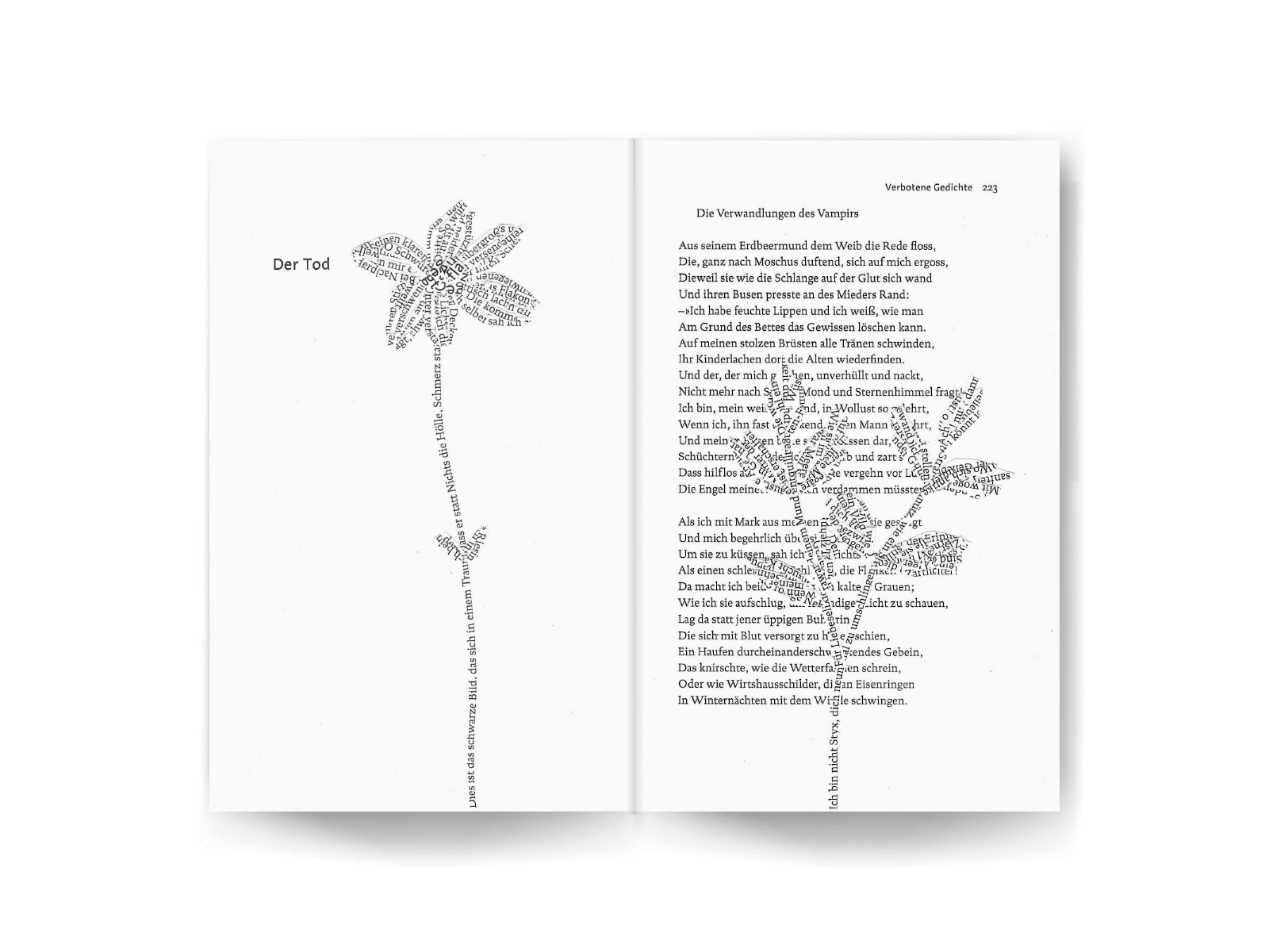 Mit einer Einführung von Thomas Miessgang Die Publikation erscheint anlässlich der Ausstellung “Dieb Lumen des Bösen” bei Christine König CHAPTER III, Wien 2025. Manfred Peckls “Dieb Lumen des Bösen” sind eine Hommage an Baudelaires „Die Blumen des Bösen“, einem der Schlüsselmomente der literarischen Moderne. Zugleich zeugen die Wort-Collagen auch von einer raffinierten Akzentverschiebung. Denn was bei Baudelaire Metapher war, entpuppt sich hier als klares Bild, dass die Texte des Gedicht-Zyklus in einen neuen Kontext stellt. Peckl, der eigentlich eher für Performances bekannt ist, experimentierte schon in der Corona-Zeit mit einer Reihe von Wortskulpturen. Was ihn an diesem “Media-Crossover” interessiert, verriet er einmal im Kunstforum: “Alles ist gleichwertig. Ich bediene mich ständig am Einen fürs Andere. In Textpassagen finden sich Bildideen, Titel. Bilder führen zu Liedern, Performance vereint Musik, Text, Bild und Skulptur, Installation.” Und so nähert er sich Baudelaires Schlüsselwerk mit einer Kulturtechnik, die an einen Cut up bzw. Remix erinnert. Ganz wie Christian Marclay in seinem Album „More Encores“ mit Soundschnipseln anderer Künstler spielt, transformiert Peckl die Verse Baudelaires mit bildkünstlerischen und sprachmanipulativen Mitteln in etwas Neues. Peckl verwendet dazu die Originalverse als Grundierung und lässt poetische Text-Fragmente sich zu pflanzlichen Wortgebilden verzweigen, überlagert von neuen Bedeutungsschichten – „Wortstängel“, „Wortkronen“, „erblindeter Text“. Wie performative Sprechakte, die Realität durch Sprache erschaffen, entstehen aus dieser Dekonstruktion neue Bedeutungssphären. Die Sprache wird nicht dargestellt, sie wird zum Kunstobjekt selbst – lebendig, mutierend, widerspenstig. “Dieb Lumen des Bösen” stoßen damit eine neue Tür auf für die Baudelaire-Rezeption. Oder, um es mit den Worten Peckls zu sagen: “FUCK, und vorbei ist die Ruhe, die Schönheit. FUCK.” Manfred Peckl “Dieb Lumen des Bösen”