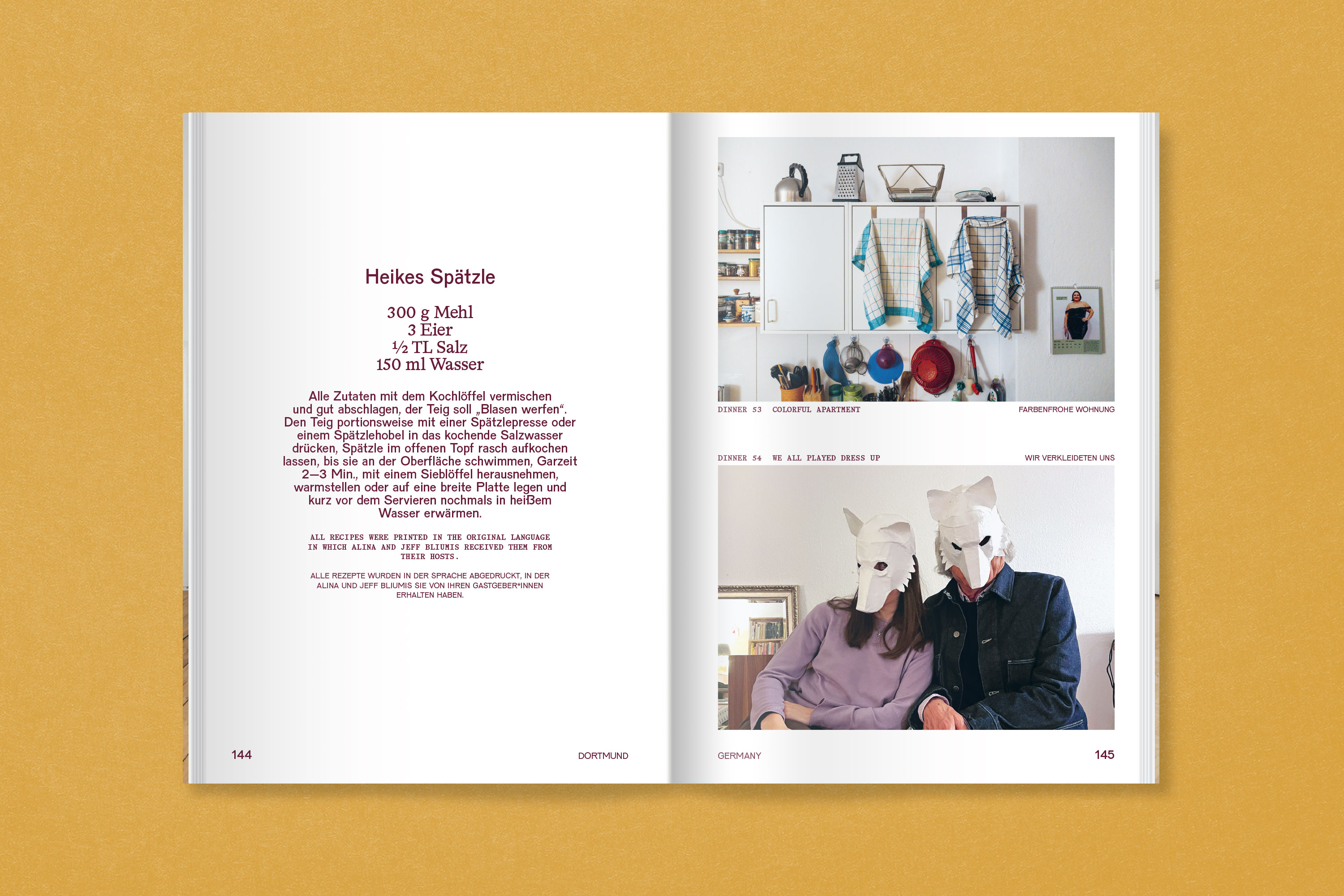Thus far, the project has been realised in Bat Yam (2008), in the Bronx (New York City, 2012), Beijing (2013), Lecce (2013), Tokyo (2021) and in Dortmund in 2025. The various photographs, impressions of the dinners and recipes of the prepared meals are for the first time compiled in this publication.