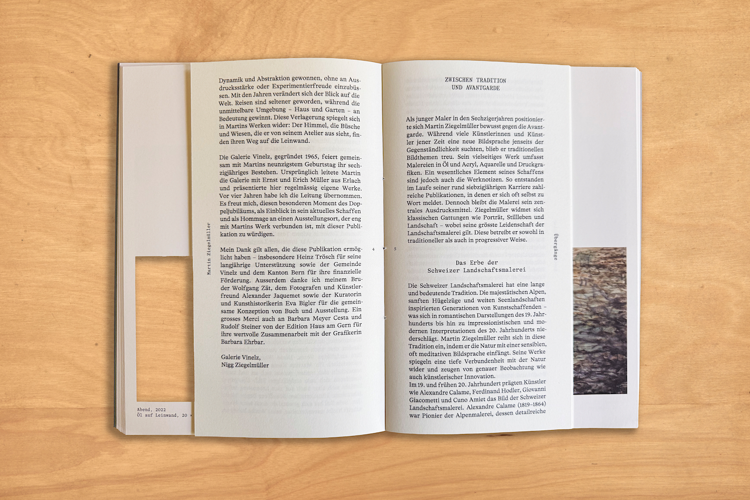 Das Thema «Übergänge» nimmt Bezug auf das Lebensalter von Martin Ziegelmüller und auf den Atelierbrand vom vergangenen Jahr: wie in seiner Malerei die Übergänge von Wasser zum Himmel, vom Fluss zum Hügel, vom Vorder- zum Hintergrund und von einer Farbe zur anderen die entscheidende Rolle spielen, muss sich Martin Ziegelmüller auch im hohen Alter immer wieder neue Übergängen meistern.