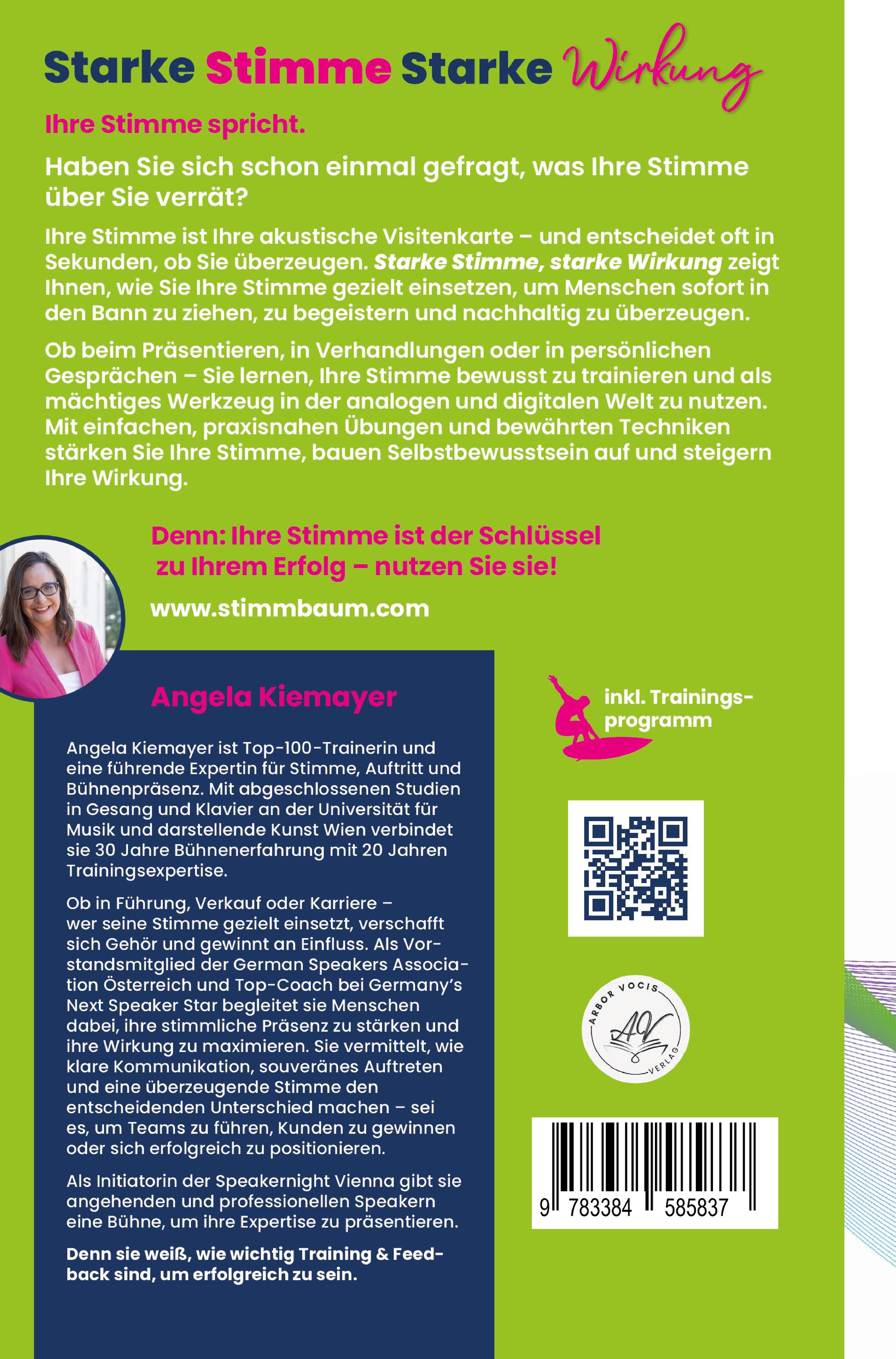 Haben Sie sich schon einmal gefragt, was Ihre Stimme über Sie verrät? Ihre Stimme ist Ihre akustische Visitenkarte – und der Schlüssel zu Ihrem Erfolg. Ob als Führungskraft, im Vertrieb, im Präsentieren oder in Verhandlungen – wer souverän und überzeugend klingt, verkauft besser, führt klarer und begeistert Menschen. Starke Stimme, starke Wirkung zeigt Ihnen, wie Sie Ihre Stimme gezielt einsetzen, um Vertrauen aufzubauen, Entscheidungen zu beeinflussen und von der ersten Sekunde an zu überzeugen. Sie lernen, Ihre Stimme bewusst zu trainieren und als mächtiges Werkzeug in der analogen und digitalen Welt zu nutzen. Mit einfachen Übungen und bewährten Techniken stärken Sie Ihre Stimme, bauen Selbstbewusstsein auf und steigern Ihre Wirkung. Denn: Ihre Stimme ist der Schlüssel zu Ihrem Erfolg – nutzen Sie sie! Angela Kiemayer ist Top100 Trainerin und eine führende Expertin für Stimme, Auftritt und Bühnenpräsenz. Mit abgeschlossenen Studien in Gesang und Klavier an der Universität für Musik und darstellende Kunst Wien vereint sie 30 Jahre Bühnenprofierfahrung mit pädagogischem Know-how und 20 Jahren Trainingserfahrung. Sie ist im Vorstand der German Speakers Association Österreich tätig und seit drei Jahren Top-Coach bei Germany’s Next Speakerstar. Sie performt nicht nur selbst regelmäßig als Trainerin, Sängerin und Keynote-Speakerin auf der Bühne, sondern bietet als Initiatorin und Organisatorin der Speakernight Vienna angehenden und professionellen Speakern die Möglichkeit, ihre Expertise zu präsentieren. Denn sie weiß, wie wichtig Training & Feedback sind, um erfolgreich zu sein.