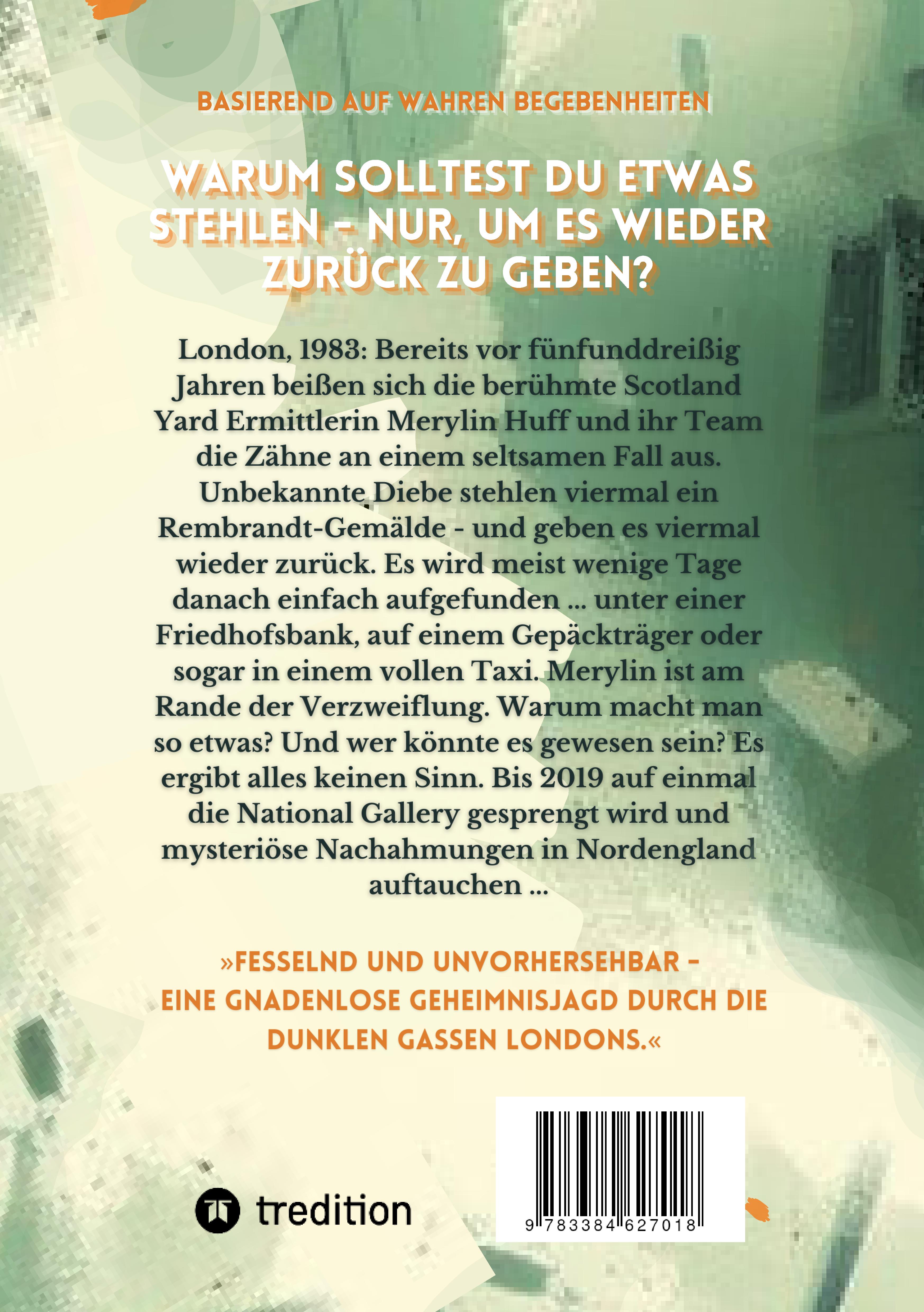 »Nach wahren Begebenheiten: Eine spannende Geheimnisjagd einmal quer durch London - mit cleveren Dieben und noch cleveren Ermittlern.« London, 1983: Bereits vor dreißig Jahren beißen sich die berühmte Scotland Yard Ermittlerin Merylin Huff und ihr Team die Zähne an einem seltsamen Fall aus. Unbekannte Diebe stehlen viermal ein Rembrandt-Gemälde - und geben es viermal wieder zurück. Die Polizei findet es meist wenige Tage danach: unter einer Friedhofsbank, auf einem Gepäckträger oder sogar in einem vollen Taxi. Merylin ist am Rande der Verzweiflung. Warum macht man so etwas? Und wer könnte es gewesen sein? Es ergibt alles keinen Sinn. Bis 2019 auf einmal die National Gallery gesprengt wird und mysteriöse Nachahmungen in Nordengland auftauchen...