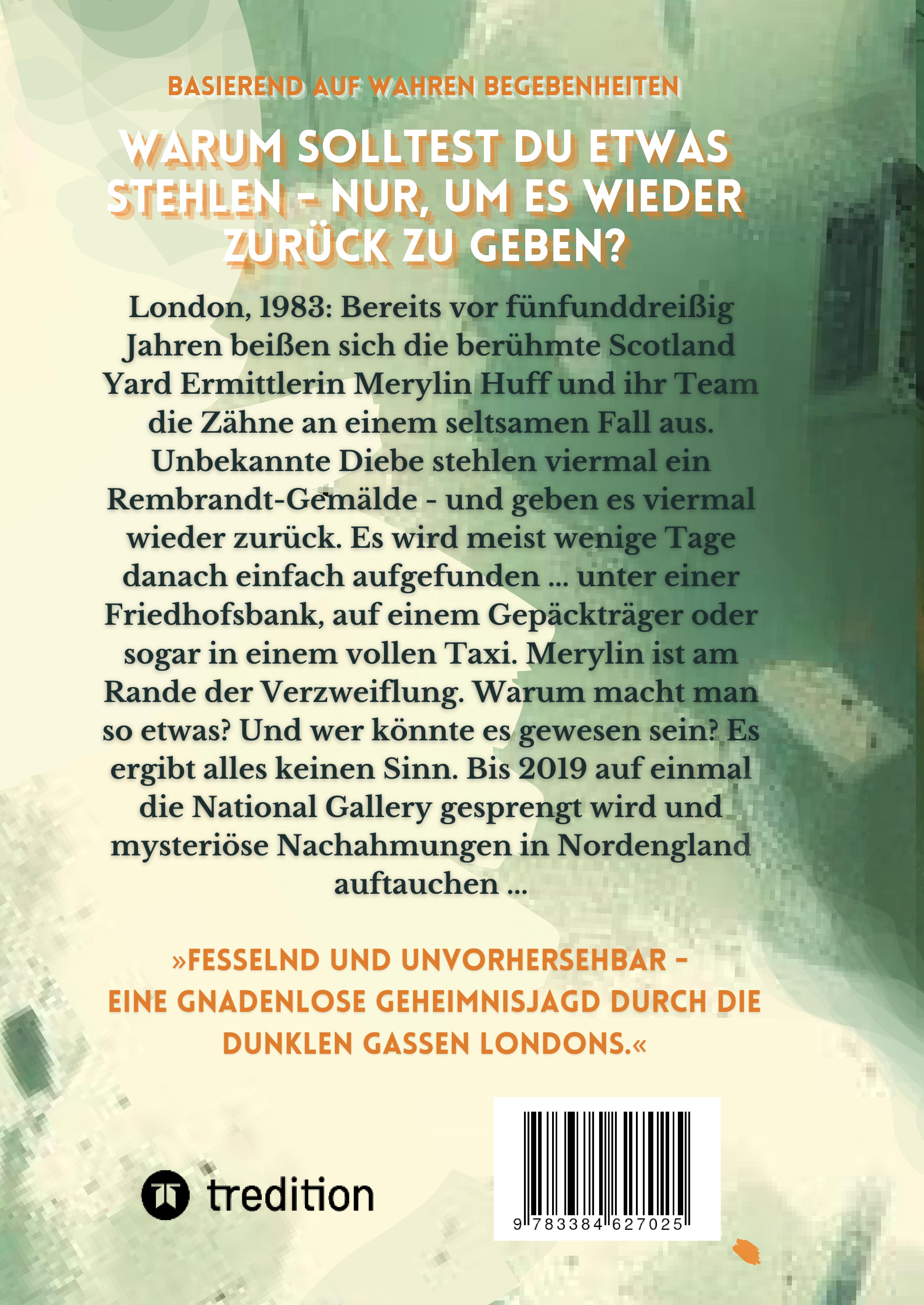 »Nach wahren Begebenheiten: Eine spannende Geheimnisjagd einmal quer durch London - mit cleveren Dieben und noch cleveren Ermittlern.« London, 1983: Bereits vor dreißig Jahren beißen sich die berühmte Scotland Yard Ermittlerin Merylin Huff und ihr Team die Zähne an einem seltsamen Fall aus. Unbekannte Diebe stehlen viermal ein Rembrandt-Gemälde - und geben es viermal wieder zurück. Die Polizei findet es meist wenige Tage danach: unter einer Friedhofsbank, auf einem Gepäckträger oder sogar in einem vollen Taxi. Merylin ist am Rande der Verzweiflung. Warum macht man so etwas? Und wer könnte es gewesen sein? Es ergibt alles keinen Sinn. Bis 2019 auf einmal die National Gallery gesprengt wird und mysteriöse Nachahmungen in Nordengland auftauchen...