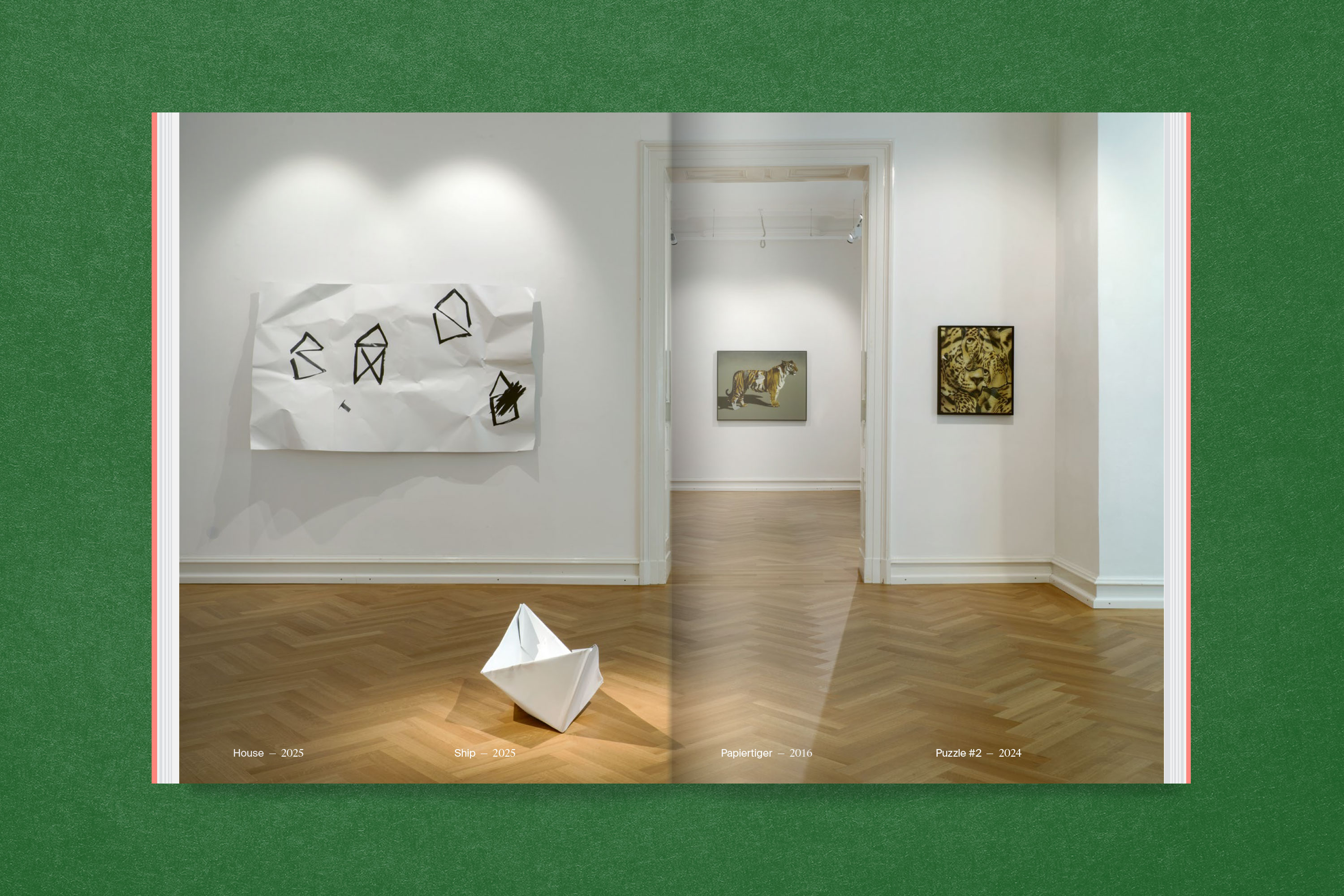 Hahns unverwechselbarer „gebrochener Realismus“ verbindet Genauigkeit mit feinem Humor und legt die Risse und Paradoxien unserer Wirklichkeit offen. In bühnenhaft arrangierten Szenen begegnen uns Tiere wie Tiger, Elefanten, Vögel oder Wölfe als Träger vielschichtiger Bedeutungen. Dabei wird das Papier selbst zum Symbol für Fragilität, Wandel und die Konstruktion von Realität. The publication presents over 50 works by Eckart Hahn (*1971), ranging from the 1990s to the present day. The focus is on works in which the motif of paper is presented in surprising and diverse ways. In Hahn's paintings, paper always remains fiction: he uses brush and paint to create an astonishingly realistic effect. We encounter paper as torn, folded or wrapped, as a book, wallpaper, house of cards, cardboard stand-up display or origami. Hahn paints written, crumpled, cut, soiled paper, paper as collage, décollage, relief, layered or in implied destruction - always with great painterly precision and imagination.