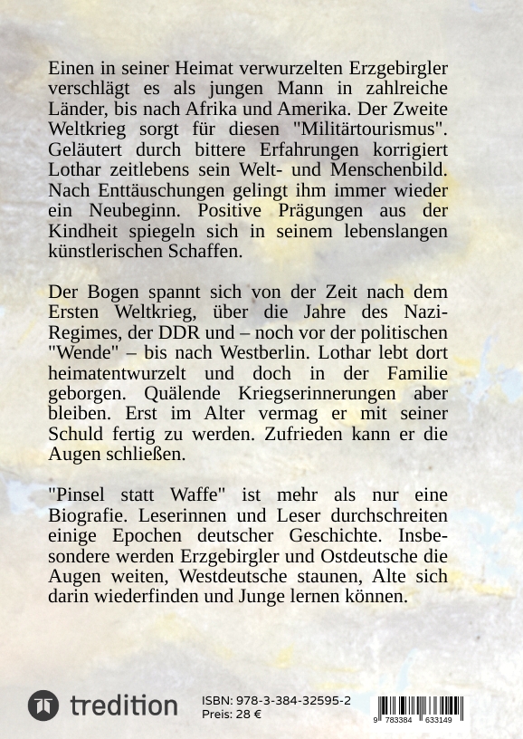 Den Autor, der 1952 im Erzgebirge das Licht der Welt erblickt, ost- und westsozialisiert ist, drängt es nach Aufarbeitung. Neben dem in der Pionierorganisation trainierten Gleichschritt für den 1. Mai, erfährt er durch die Eltern eine christliche Prägung. Gespalten zwischen den Erfahrungen in der Schule und denen im Elternhaus, perfektioniert er dieses Doppelleben. Kann das so weitergehen? Wie und wo möchte ich leben, fragt sich Christian Nestler. Nach Familiengründung, politischer Haft, Systemwechsel und Neuorientierung werden die Fragen nach dem Richtig und Falsch, nach Krieg und Frieden, nach Perspektiven für Mensch und Natur drängender. Für ihn wird das Schreiben zunehmend ein wichtiger Faktor zum Begreifen, zum Verarbeiten. Den viel zu frühen Verlust seiner Ehefrau kann er nur ertragen, indem er Gefühle und Gedanken zu Papier bringt. Es entsteht die Trilogie „Leben nach dem Tod“. In Pinsel statt Waffe nimmt sich der Autor das düsterste Kapitel der deutschen Geschichte vor und lässt dabei ein lebendiges Bild des Vaters und ehemaligen Kriegssoldaten entstehen. Mit Aufzeichnen des väterlichen Lebens und Einsichten aus den verschiedenen Gesellschaftssystemen möchte der Verfasser dazu anregen, sich für ein Leben in Demokratie und Frieden einzusetzen.