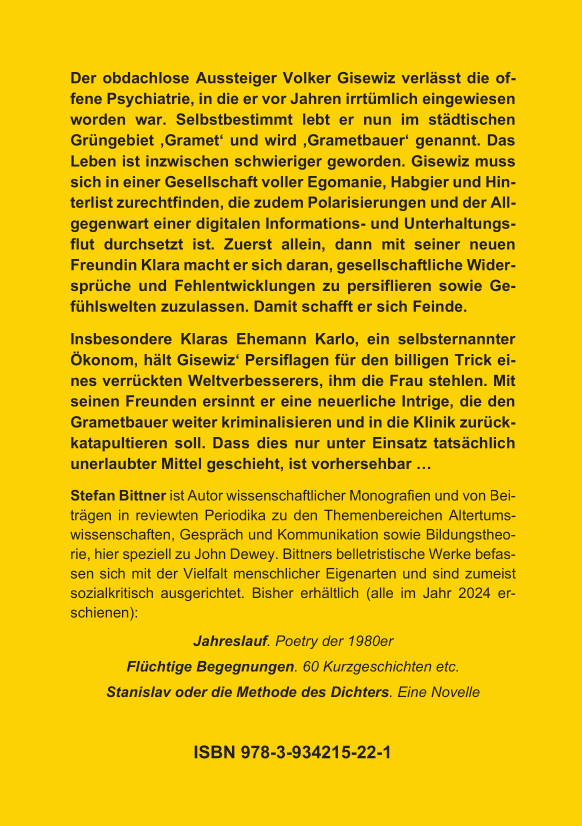 Der obdachlose Aussteiger Volker Gisewiz lebt selbstbestimmt im Naherholungsgebiet 'Gramet' und wird deswegen ‚Grametbauer‘ genannt. Er muss sich in einer Gesellschaft voller Egomanie, Habgier und Hinterlist zurechtfinden, die zudem von Polarisierungen und der Allgegenwart einer digitalen Informations- und Unterhaltungsflut durchsetzt ist. Mit seiner neuen Bekannten Klara persifliert er gesellschaftliche Widersprüche und Fehlentwicklungen und lässt Gefühlswelten zu. Das ruft Klaras Ehemann Karlo auf den Plan, der als selbsternannter Finanzfachmann die Lebensfreude seines Konkurrenten für den billigen Trick eines verrückten Weltverbesserers hält, ihm die Frau auszuspannen. Mit einem geheimnisvollen Freund ersinnt er eine Intrige, die den Grametbauer kriminalisieren und in die Psychiatrie bringen soll. Natürlich geschieht dies unter Einsatz unerlaubter Mittel ... Der obdachlose Aussteiger Volker Gisewiz lebt selbstbestimmt im Naherholungsgebiet 'Gramet' und wird deswegen ‚Grametbauer‘ genannt. Er muss sich in einer Gesellschaft voller Egomanie, Habgier und Hinterlist zurechtfinden, die zudem von Polarisierungen und der Allgegenwart einer digitalen Informations- und Unterhaltungsflut durchsetzt ist. Mit seiner neuen Bekannten Klara persifliert er gesellschaftliche Widersprüche und Fehlentwicklungen und lässt Gefühlswelten zu. Das ruft Klaras Ehemann Karlo auf den Plan, der als selbsternannter Finanzfachmann die Lebensfreude seines Konkurrenten für den billigen Trick eines verrückten Weltverbesserers hält, ihm die Frau auszuspannen. Mit einem geheimnisvollen Freund ersinnt er eine Intrige, die den Grametbauer kriminalisieren und in die Psychiatrie bringen soll. Natürlich geschieht dies unter Einsatz unerlaubter Mittel ...
