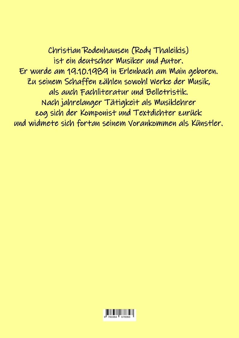 Christian Rodenhausen (Rody Thaleikis) ist ein deutscher Musiker und Autor. Er wurde am 19.10.1989 in Erlenbach am Main geboren. Zu seinem Schaffen zählen sowohl Werke der Musik, als auch Fachliteratur und Belletristik (wie beispielsweise sein Roman "Himmelwärts"). Nach jahrelanger Tätigkeit als Musiklehrer zog sich der Komponist und Textdichter zurück und widmete sich fortan seinem Vorankommen als Künstler.