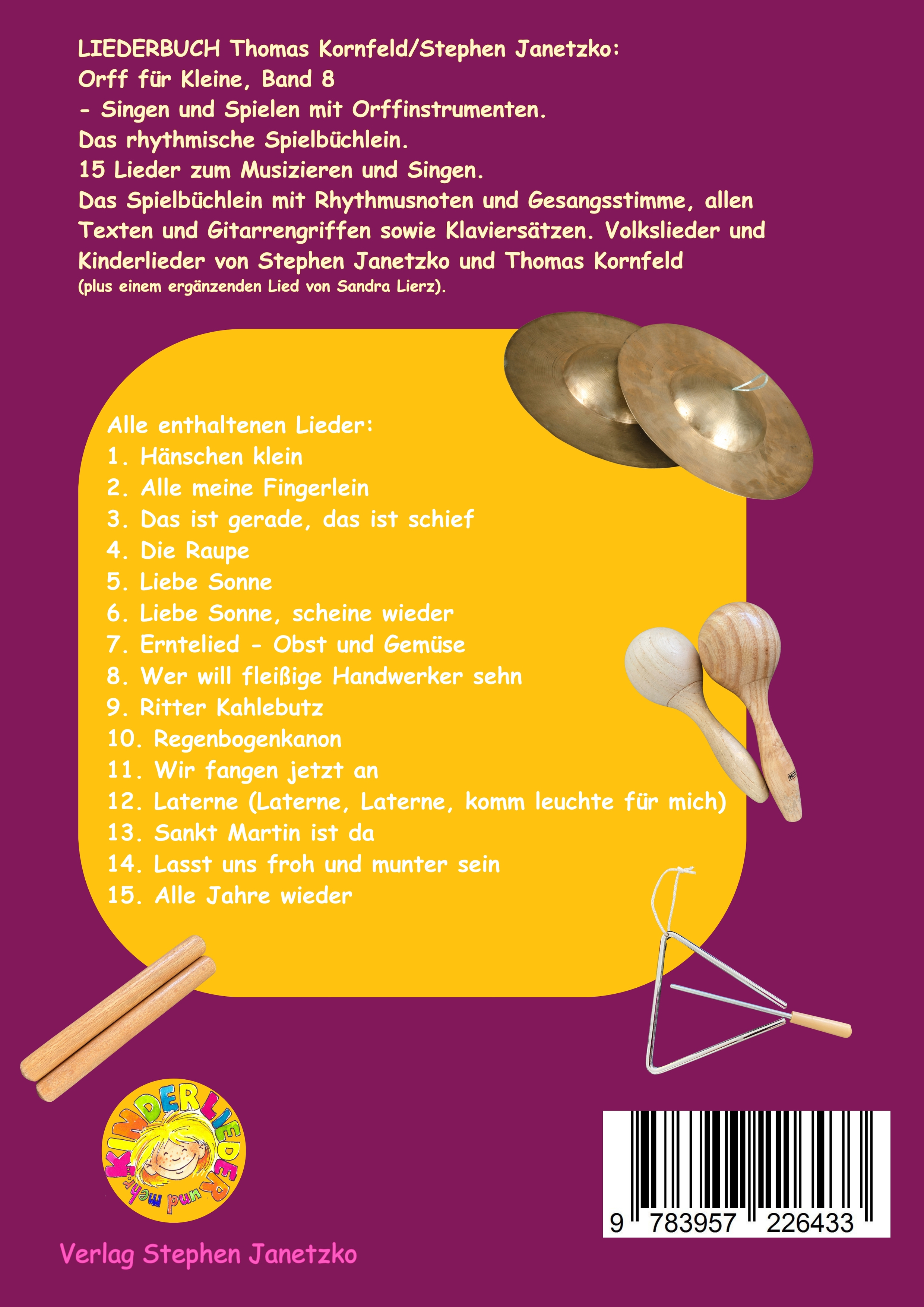 Orff für Kleine, Band 8 - Singen und Spielen mit Orffinstrumenten. Das rhythmische Spielbüchlein. 15 Lieder zum Musizieren und Singen. Das Spielbüchlein mit Rhythmusnoten und Gesangsstimme, allen Texten und Gitarrengriffen sowie Klaviersätzen. Volkslieder und Kinderlieder von Stephen Janetzko und Thomas Kornfeld (plus einem ergänzenden Lied von Sandra Lierz). Orff für Kleine wendet sich an die Altersgruppe zwischen 5 und 8 Jahren. Neben dem Singen soll hier auch besonders das rhythmische Gefühl der Kinder mit dem Orffinstrumentarium angesprochen und die Rhythmisierungsfähigkeiten weiterentwickelt werden. Dazu wurden Volks- und Kinderlieder unter besonderen Kriterien ausgesucht: - 8 bis maximal 16-taktige Lieder - Melodie- und/oder Textwiederholungen für schnelleres und einprägsames Erlernen - Tonumfang maximal eine Oktave - inhaltlich passende Lieder für das Musizieren mit Orffinstrumenten Zu jedem Lied wurden zwei Orffinstrumente notiert. Sie können einzeln, gegebenenfalls auch miteinander zum Lied musiziert werden. Das Singen und Spielen wird sich anfänglich meistens auf die erste Strophe eines jeden Liedes beschränken. Die Rhythmen sind einfach und durch mehrfaches Wiederholen schnell und leicht nachvollziehbar. Wir haben den Vokalnoten mit Text und Gitarrenharmonien auch den Rhythmus jeweils eines Orffinstrumentes auf einer Notenlinie zugestellt. Zu jedem Lied gibt es zwei Vokalfassungen mit unterschiedlichen Orffinstrumenten. Zusätzlich kann die Klavierbegleitung zum Gesang und dem Spiel der Orffinstrumente eingesetzt werden. Die Melodie der Lieder wird dabei detailgetreu unterstützt. Darüber hinaus stellen wir alle Klavierbegleitungen mit den Rhythmen der Orffinstrumente von Thomas Kornfeld instrumental zur Demonstration, zum Mitspielen, Üben und Anhören als Audios zum Download bereit (separat über alle gängigen Download- und Streaming-Plattformen, wo auch die meisten Lieder in gesungener Form vorliegen). Viel Freude und Erfolg beim Singen und Musizieren wünschen die Autoren. PS. Weitere Ausgaben in selber Aufmachung sind in dieser Reihe erhältlich. Alle enthaltenen Lieder: 1. Hänschen klein 2. Alle meine Fingerlein 3. Das ist gerade, das ist schief 4. Die Raupe 5. Liebe Sonne 6. Liebe Sonne, scheine wieder 7. Erntelied - Obst und Gemüse 8. Wer will fleißige Handwerker sehn 9. Ritter Kahlebutz 10. Regenbogenkanon 11. Wir fangen jetzt an 12. Laterne (Laterne, Laterne, komm leuchte für mich) 13. Sankt Martin ist da 14. Lasst uns froh und munter sein 15. Alle Jahre wieder Anhang: Spielhaltung der Orffinstrumente in Abbildungen - Triangel, Handtrommel - Becken, Pauke- Klanghölzer (große und kleine Hände) - Schellenring, Glockenkranz/Schellenkranz - Holzblocktrommel, Röhrenholztrommel/Wooden Agogo - Rassel/Maracas, Cymbals - Glockenspiel (Sopran-Glockenspiel) Zu diesem Spielbüchlein ist separat ein Download/Streaming-Album mit allen Klaviersätzen mit den Rhythmen der Orffinstrumente erschienen.