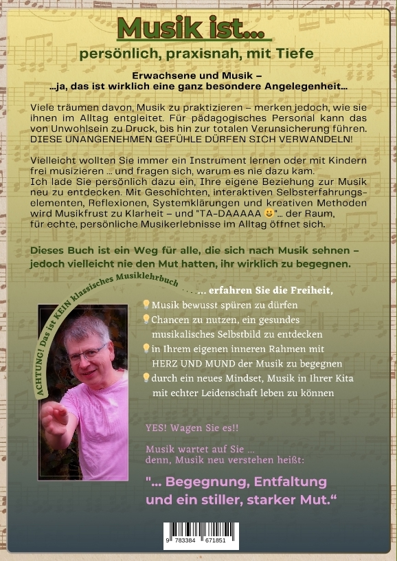 Musik ist... MEHR als Bildung, lautet der Titel, denn der Hintergrund und die Schreibmotivation dieses Buches ist "MUSIK NEU VERSTEHEN" zu können.Musik neu zu ergreifen, fühlen, neu lieben lernen und so tiefer zu verstehen ist eigentlich die Kernmotivation dieses Buches. Es ist ein interaktiver Wegweiser für ein musikalisches Mindset-Building - für Erzieher:innen und alle, die Musik neu entdecken wollen.Dieses Buch ist kein klassisches Musiklehrbuch oder Liederbuch, bzw. Technikbuch, in denen dem Leser harte Musik-Skills beigebracht werden sollen. Der Grund ist, dass jeder Mensch, der Musik praktizieren möchte, andere Dinge benötigt. Es ist eine Einladung. Ein Impulsgeber. Und ein Perspektivwechsel. - weg von den "gewohnten Fortbildungsinhalten der Bildungsbücher für Pädagogen" - hin zu einem tieferen Ansatz.Dieses Buch richtet sich nämlich PRAKTISCH an pädagogische Fachkräfte in Kindergärten - aber auch an Erwachsene, die spüren, dass Musik zu ihrem Leben gehört, obwohl sie sich vielleicht unsicher oder blockiert fühlen.Fragen wie: "Bin ich musikalisch genug? Wo darf ich anfangen?" - wird hierbei begegnet. Sie stehen oft im Raum. Dieses Buch gibt keine einfachen Antworten, aber es bietet Wege.WAS ABER JEDER BENÖTIGT IST EIN BASISFUNDAMENT UND EINE GEWISSE BEZIEHUNG DER MUSIK GEGENÜBER! - Da liegt der Buchansatz!Das ist Sebastians Nische, die das Ziel hat, Basiskompetenzen zu schaffen, damit der Leser mit der Musik erfolgreich und glücklich eine Connection herstellen, und schließlich Musik praktizieren kann. OHNE SCHEU!Er greift speziell Kindergärten betreffend die Thematik auf, dass persönliche Musik abnimmt. Er zeigt Systeme auf, warum das so ist und zeigt einen Weg aus der Misere heraus. Das Buch hat 3 Teile. Hinführung zum Thema, der Fachbuchteil für's päd. Personal und letztlich ein softer Ratgeber für "Instrument lernende Erwachsene". Alles gehört zusammen. Basisbildung - Kompetenzaufbau - Praxis...Sebastian Dorn ist als Diplom-Musikpädagoge, erfahrener Erzieher, Komponist und Musikproduzent Weit aufgestellt und kann den Leser durch diese drei ineinandergreifenden Teile mit fachlich gestalteten Inhalten, systemischen Ansätze, praktischen Impulsen und persönlichen Geschichten in eine lebendige Musik-Erlebniswelt führen. Es ist gewünscht durch das "Aktiv bewusste Auseinandersetzen" mit Musik z.B. dem hören ungewohnter Musik, zu fühlen und zu spüren!Entstanden ist dieses Buch, weil er ungute Muster bei Kolleg:innen in den 20 Dienstjahren als Erzieher beobachtete! Typische innere Hürden zeigt er dementsprechend auf und erklärt, was musikalische Entwicklung im Erwachsenenalter verhindert und was sie auch stärkt!Im Zentrum steht dabei ein neuer Blick auf musikalische Professionalität: Sie beginnt nicht bei Technik, sondern bei Haltung. Nicht bei Noten, sondern beim Mut, sich selbst zu erlauben, musikalisch zu sein.Du wirst praktisch erfahren:- wie die Folgen musikalischer Blockaden sind - und beginnst sie aufzulösen- wie ein gesundes musikalisches Selbstbild entsteht- wie du ein musikalisches Mindset entwickelst, das trägt- wie du durch deinen Lernprozess professionell und authentisch mit Kindern musizieren könntestund: warum Musik mehr ist als Bildung - für Kinder, aber vor allem auch für dich selbstDieses Buch ist kein Rezeptbuch.Es ist ein Wegweiser, ein Praxishelfer und ein Begleiter auf Deinem ganz eigenen musikalischen Weg.Musik ist Verbindung. Mut. Und Selbstwirksamkeit.