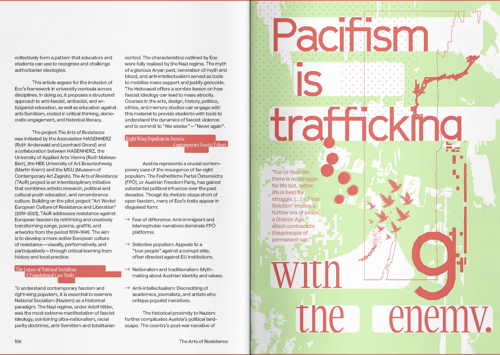 "Resistance requires not only critical thinking, but also new aesthetic approaches. This project addresses this significant challenge."Ilija Trojanow, writer, translator and publisher"I would have loved to take part myself: To learn about historical fascism, to detect and recognise its current forms, and how, despite our different origins and strategies, we fundamentally belong to the same side. These days, the way frontlines are drawn is so unbearably ugly and banal, it seems not just reasonable to develop an art of resistance, it could also be beautiful."Eva Menasse, writerThe Arts of Resistance constitutes a collaborative and intergenerational artistic research inquiry into the historical and contemporary (artistic) means of resistance against fascism, initiated by Ruth Anderwald + Leonhard Grond as part of their long-term engagement with the topic.