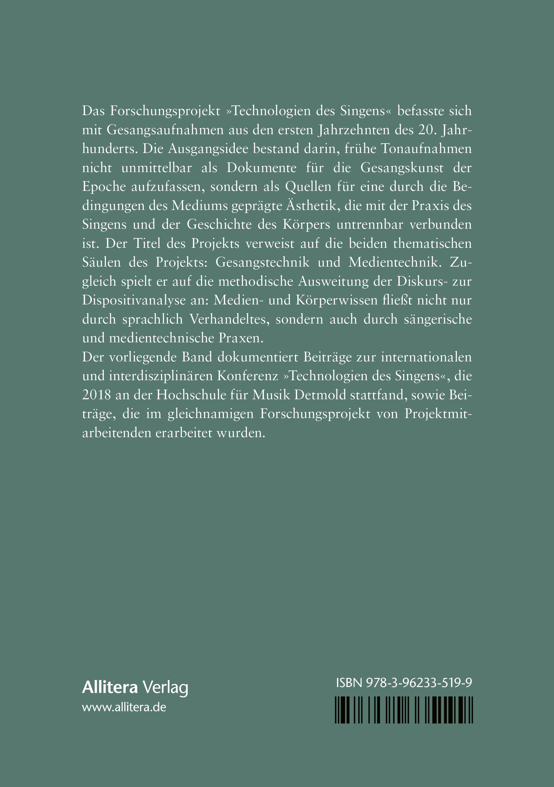 Das Forschungsprojekt "Technologien des Singens" befasste sich mit Gesangsaufnahmen aus den ersten Jahrzehnten des 20. Jahrhunderts. Die Ausgangsidee bestand darin, frühe Tonaufnahmen nicht unmittelbar als Dokumente für die Gesangskunst der Epoche aufzufassen, sondern als Quellen für eine durch die Bedingungen des Mediums geprägte Ästhetik, die mit der Praxis des Singens und der Geschichte des Körpers untrennbar verbunden ist. Der Titel des Projekts verweist auf die beiden thematischen Säulen des Projekts: Gesangstechnik und Medientechnik. Zugleich spielt er auf die methodische Ausweitung der Diskurs- zur Dispositivanalyse an: Medien- und Körperwissen fließt nicht nur durch sprachlich Verhandeltes, sondern auch durch sängerische und medientechnische Praxen.Der vorliegende Band dokumentiert Beiträge zur internationalen und interdisziplinären Konferenz "Technologien des Singens", die 2018 an der Hochschule für Musik Detmold stattfand, sowie Beiträge, die im gleichnamigen Forschungsprojekt von Projektmitarbeitenden erarbeitet wurden.