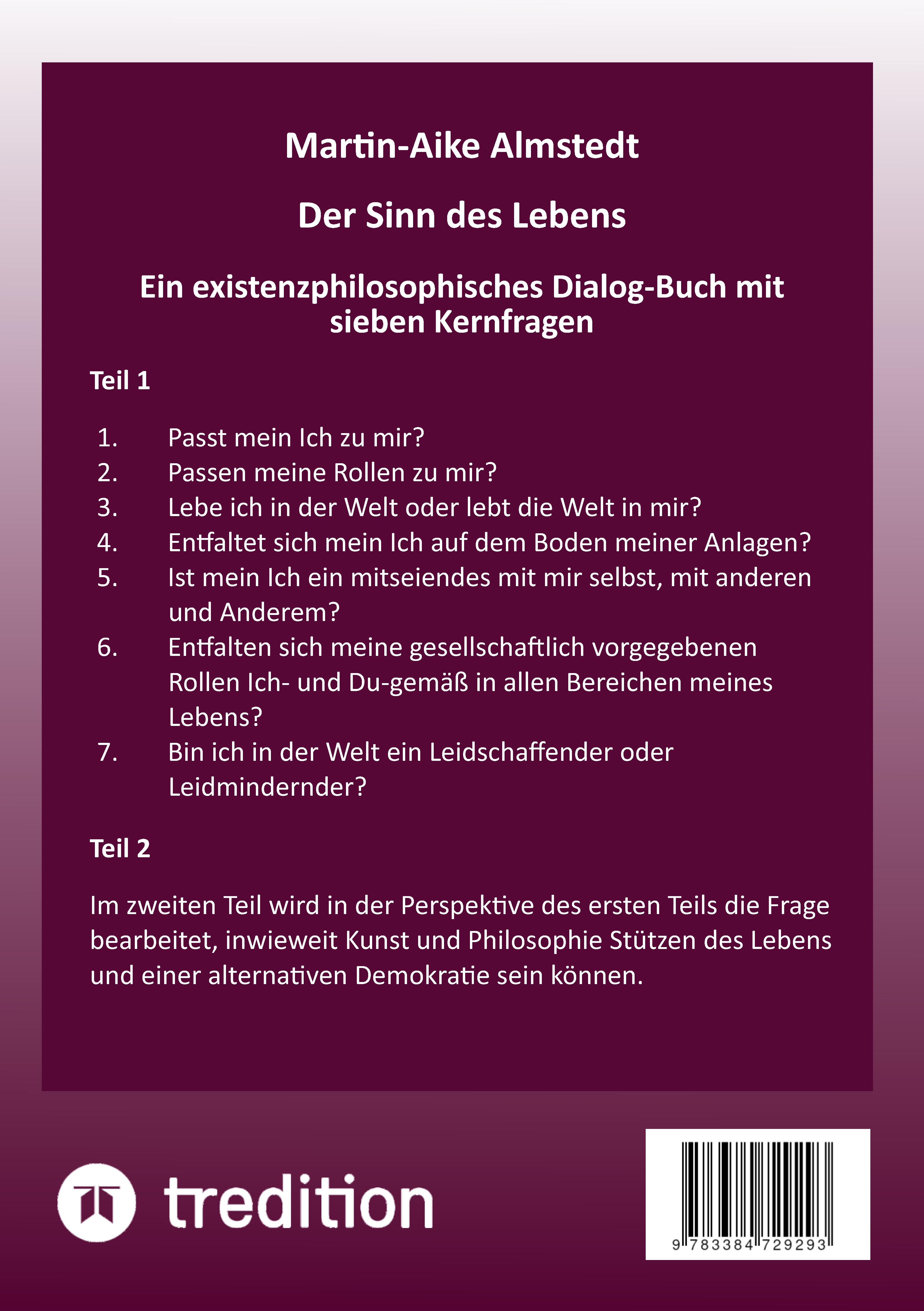 Martin-Aike Almstedt - Der Sinn des LebensEin existenzphilosophisches Dialog-Buch mit sieben Kernfragen Teil 11.Passt mein Ich zu mir?2.Passen meine Rollen zu mir?3.Lebe ich in der Welt oder lebt die Welt in mir? 4.Entfaltet sich mein Ich auf dem Boden meiner Anlagen? 5.Ist mein Ich ein mitseiendes mit mir selbst, mit anderen und Anderem?6.Entfalten sich meine gesellschaftlich vorgegebenen Rollen Ich- und Du-gemäß in allen Bereichen meines Lebens?7.Bin ich in der Welt ein Leidschaffender oder Leidmindernder?Teil 2Im zweiten Teil wird in der Perspektive des ersten Teils die Frage bearbeitet, inwieweit Kunst und Philosophie Stützen des Lebens und einer alternativen Demokratie sein können.