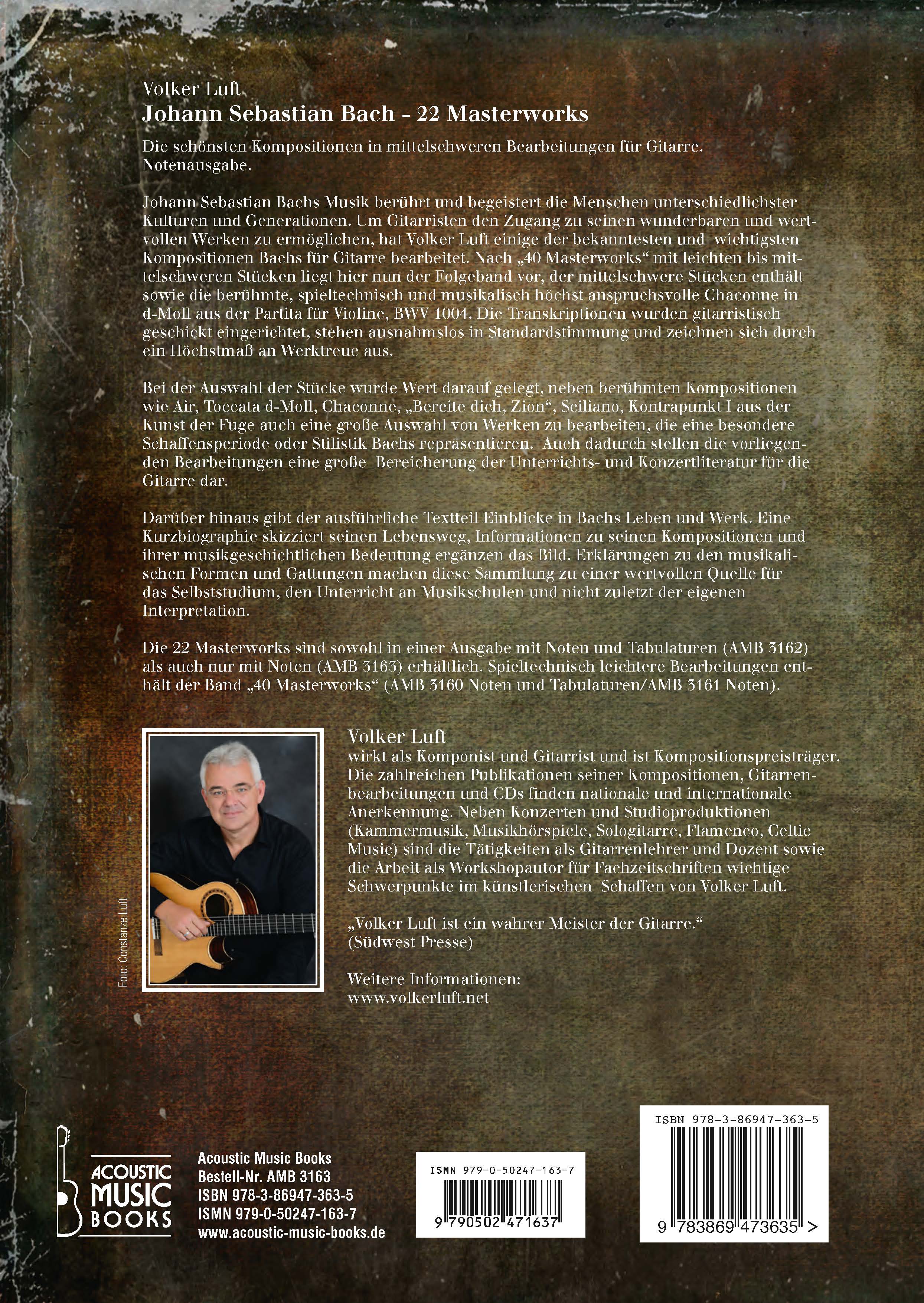 Johann Sebastian Bachs Musik berührt und begeistert die Menschen unterschiedlichster Kulturen und Generationen. Um Gitarristen den Zugang zu seinen wunderbaren und wertvollenWerken zu ermöglichen, hat Volker Luft einige der bekanntesten und wichtigsten Kompositionen Bachs für Gitarre bearbeitet. Nach „40 Masterworks“ (AMB 3160/3161) mit leichten bis mittelschweren Stücken liegt der Folgeband nun auch in er Version nur mit Noten, ohne Tabulaturen vor. Notenfeste Gitarristen kommen in den Genuss einer übersichtlicheren Fassung der 22 Masterworks mit duetlich weniger Wendestellen. Der Band enthält mittelschwere Stücke sowie die berühmte, spieltechnisch und musikalisch höchst anspruchsvolle Chaconne in d-Moll aus der Partita für Violine, BWV 1004. Die Transkriptionen wurden gitarristisch geschickt eingerichtet, stehen ausnahmslos in Standardstimmung und zeichnen sich durch ein Höchstmaß an Werktreue aus.