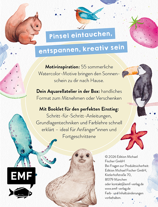 Du liebst es zu malen, hast aber wenig Zeit oder möchtest dich auch ohne viel Aufwand mit Farbe austoben? Dieses Kartenset bringt dir 55 liebevoll illustrierte Watercolor-Motive direkt nach Hause - perfekt zum Nachmalen, Üben oder einfach zum Abschalten. Mini-Aquarelle, die schnell gelingen und richtig Spaß machen! Ob für zuhause, als Geschenk oder für den cozy Mal-Abend mit Freunden - dieses Kartenset bietet 55 sorgfältig ausgewählte Watercolor-Motive für jeden Anlass. Für Anfänger*innen genauso praktisch wie für Fortgeschrittene. Ergänzt wird das Kartenset durch ein praktisches Booklet, das die wichtigsten Malgrundlagen anschaulich erklärt.