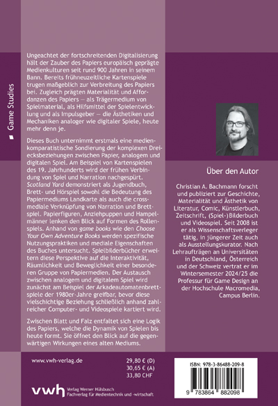 Dieses Buch unternimmt erstmals eine medienkomparatistische Sondierung der komplexen Dreiecksbeziehungen zwischen Papier, analogem und digitalen Spiel. Am Beispiel von Kartenspielen des 19. Jahrhunderts wird der frühen Verbindung von Spiel und Narration nachgespürt. „Scotland Yard“ demonstriert als Jugendbuch, Brett- und Hörspiel sowohl die Bedeutung des Papiermediums Landkarte als auch die crossmediale Verknüpfung von Narration und Brettspiel. Papierfiguren, Anziehpuppen und Hampelmänner lenken den Blick auf Formen des Rollenspiels. Anhand von ,game books‘ wie den „Choose Your Own Adventure Books“ werden spezifische Nutzungspraktiken und mediale Eigenschaften des Buches untersucht. Spielbilderbücher erweitern diese Perspektive auf die Interaktivität, Räumlichkeit und Beweglichkeit einer besonderen Gruppe von Papiermedien. Der Austausch zwischen analogem und digitalem Spiel wird zunächst am Beispiel der Arkadeautomatenbrettspiele der 1980er-Jahre greifbar, bevor diese vielschichtige Beziehung schließlich anhand zahlreicher Computer- und Videospiele kartiert wird.