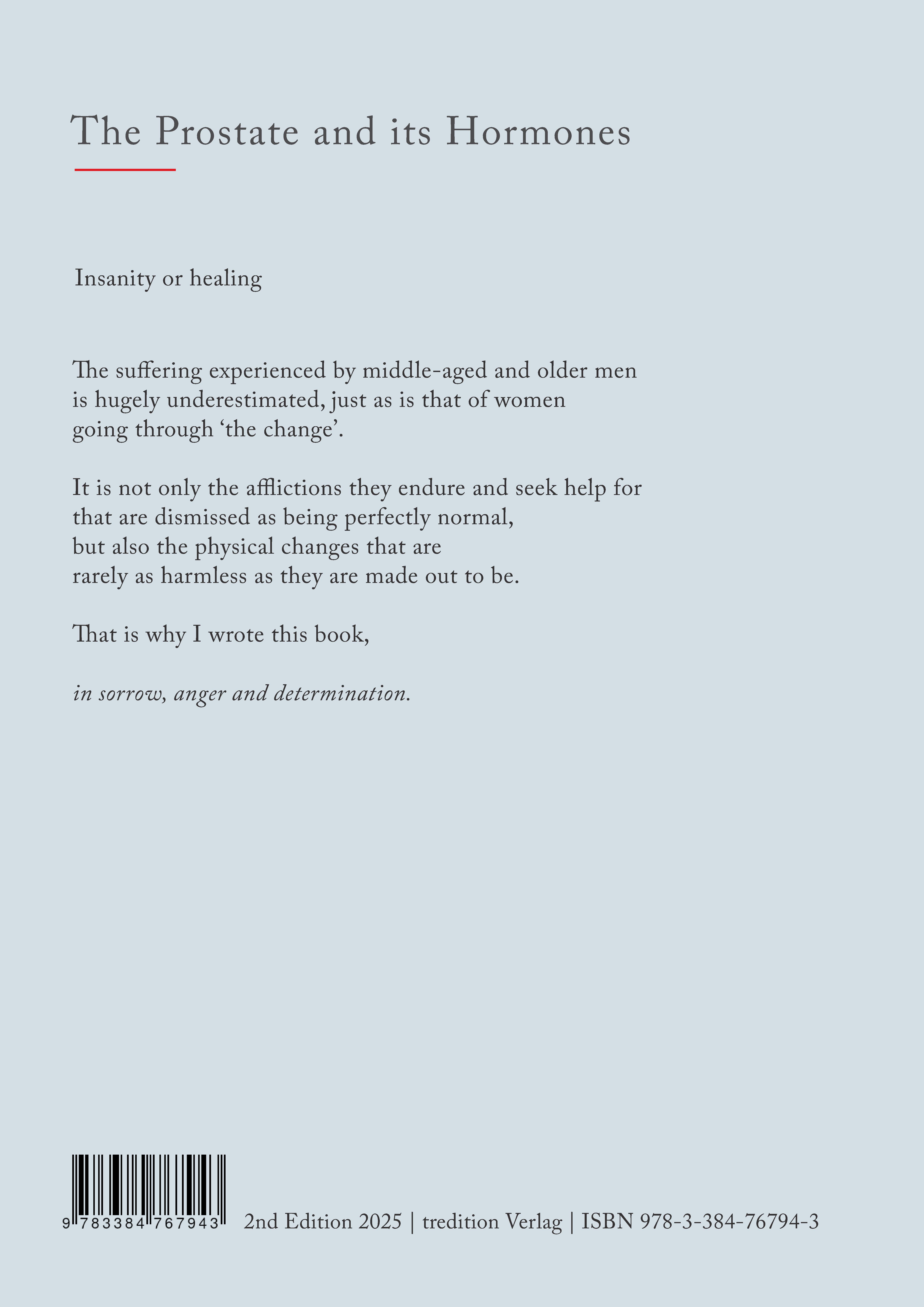 | Schlagworte | Adrenocortical hormone • Ageing • alone • Andrologist • Bioidentical • Bioidentical hormones • Bladder sphincter • carcinoma • Chemo • Conventional therapy • Cortisol • coupling • CyberKnife • Dehydroepiandrosterone • Desire • Develpoment • DHEA-S • Dihydrotestosterone • ejaculation • Energy • erection • Experimental hormone therapy • fear • female • FSH • Gonadal sex hormones • gonads • Hea • HoLEP • Hormone network • hormones • Hormone treatment for prostate disorder • humans • hyperplasia • Hypophyseal hormone • Hypothalamus • impotence • incontinence • Information • Knowledge • LH • Libido • light • Light-dependent steroid hormone • Male • MAN • manneken pis • Mesonephric Duct • Metastasis • MRI • NanoKnife • Nature • Nocturia • Oestradiol • Operation • Paramesonephric ducts • pharmaceuticals • phytotherapy • Pissing contest • Pollakisuria • Potency • Pregnenolone • progesterone • Prostate • Prostate Cancer • Prostate changes • Prostate disorder • Prostate disorder in a psychological, social, medical and cultural context • Prostate Gland • Prostatic • Prostatic hyperplasia • PSA • questions • Radiation • Radical prostatectomy • Rimkus • Rimkus method • Sex Hormone Binding Globulin • SHBG • Steroid Hormones • Steroids • Systems Theory • Testosterone • Time • Ultrasound • Urinary Retention • Urination • Urine bag • Vitamin D3 • Woman • World • year • years |