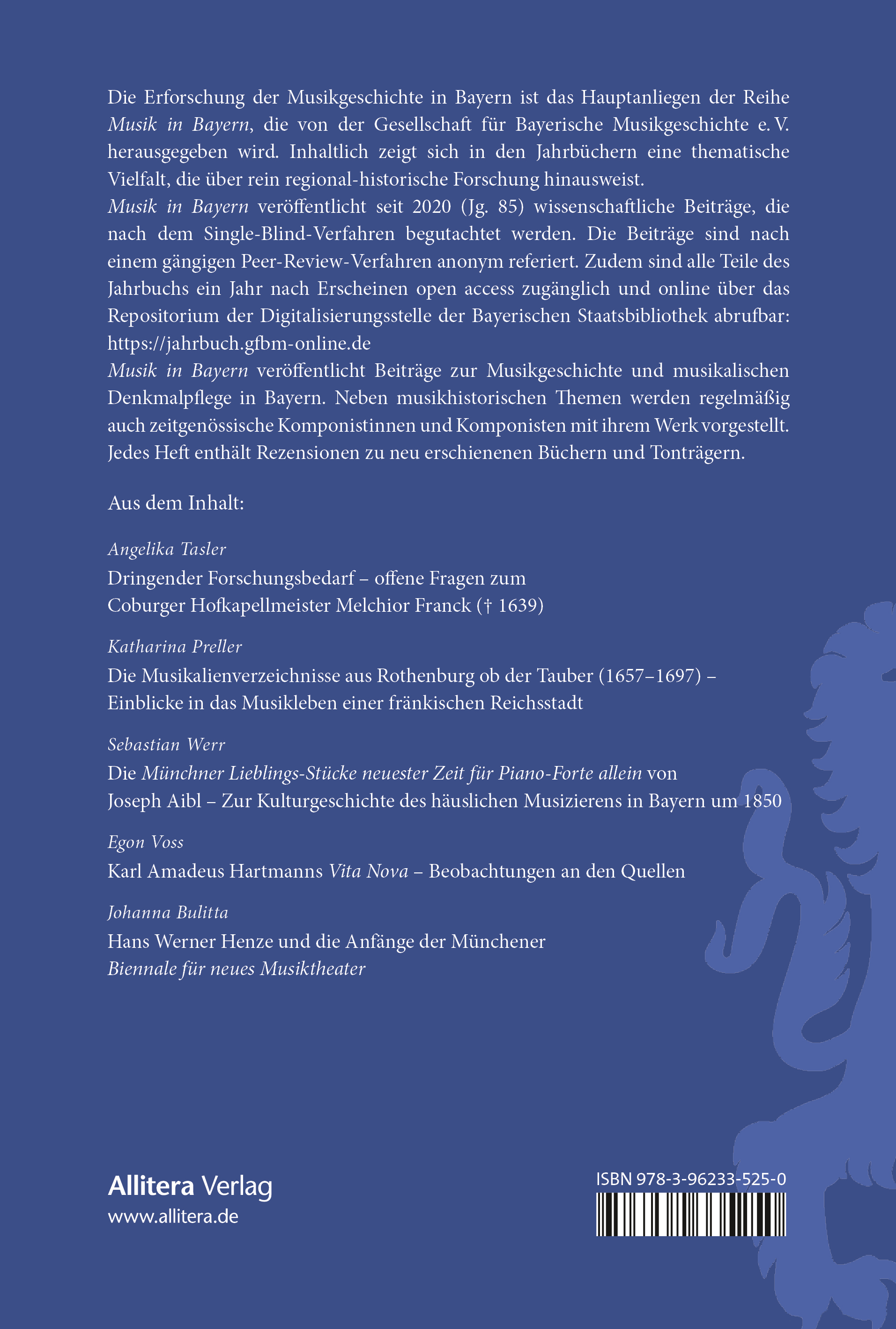 Die Erforschung der Musikgeschichte in Bayern ist das Hauptanliegen der Reihe Musik in Bayern, die von der Gesellschaft für Bayerische Musikgeschichte e._V. herausgegeben wird. Inhaltlich zeigt sich in den Jahrbüchern eine thematische Vielfalt, die über rein regional-historische Forschung hinausweist.Musik in Bayern veröffentlicht seit 2020 (Jg. 85) wissenschaftliche Beiträge, die nach dem Single-Blind-Verfahren begutachtet werden. Die Beiträge sind nach einem gängigen Peer-Review-Verfahren anonym referiert. Zudem sind alle Teile des Jahrbuchs ein Jahr nach Erscheinen open access zugänglich und online über das Repositorium der Digitalisierungsstelle der Bayerischen Staatsbibliothek abrufbar: https://jahrbuch.gfbm-online.deMusik in Bayern veröffentlicht Beiträge zur Musikgeschichte und musikalischen Denkmalpflege in Bayern. Neben musikhistorischen Themen werden regelmäßig auch zeitgenössische Komponistinnen und Komponisten mit ihrem Werk vorgestellt. Jedes Heft enthält Rezensionen zu neu erschienenen Büchern und Tonträgern.Aus dem Inhalt:Angelika TaslerDringender Forschungsbedarf - offene Fragen zum Coburger Hofkapellmeister Melchior Franck (_ 1639)Katharina PrellerDie Musikalienverzeichnisse aus Rothenburg ob der Tauber (1657-1697) - Einblicke in das Musikleben einer fränkischen Reichsstadt_Sebastian WerrDie Münchner Lieblings-Stücke neuester Zeit für Piano-Forte allein von Joseph Aibl - Zur Kulturgeschichte des häuslichen Musizierens in Bayern um 1850_Egon VossKarl Amadeus Hartmanns Vita Nova - Beobachtungen an den Quellen_Johanna BulittaHans Werner Henze und die Anfänge der Münchener Biennale für neues Musiktheater