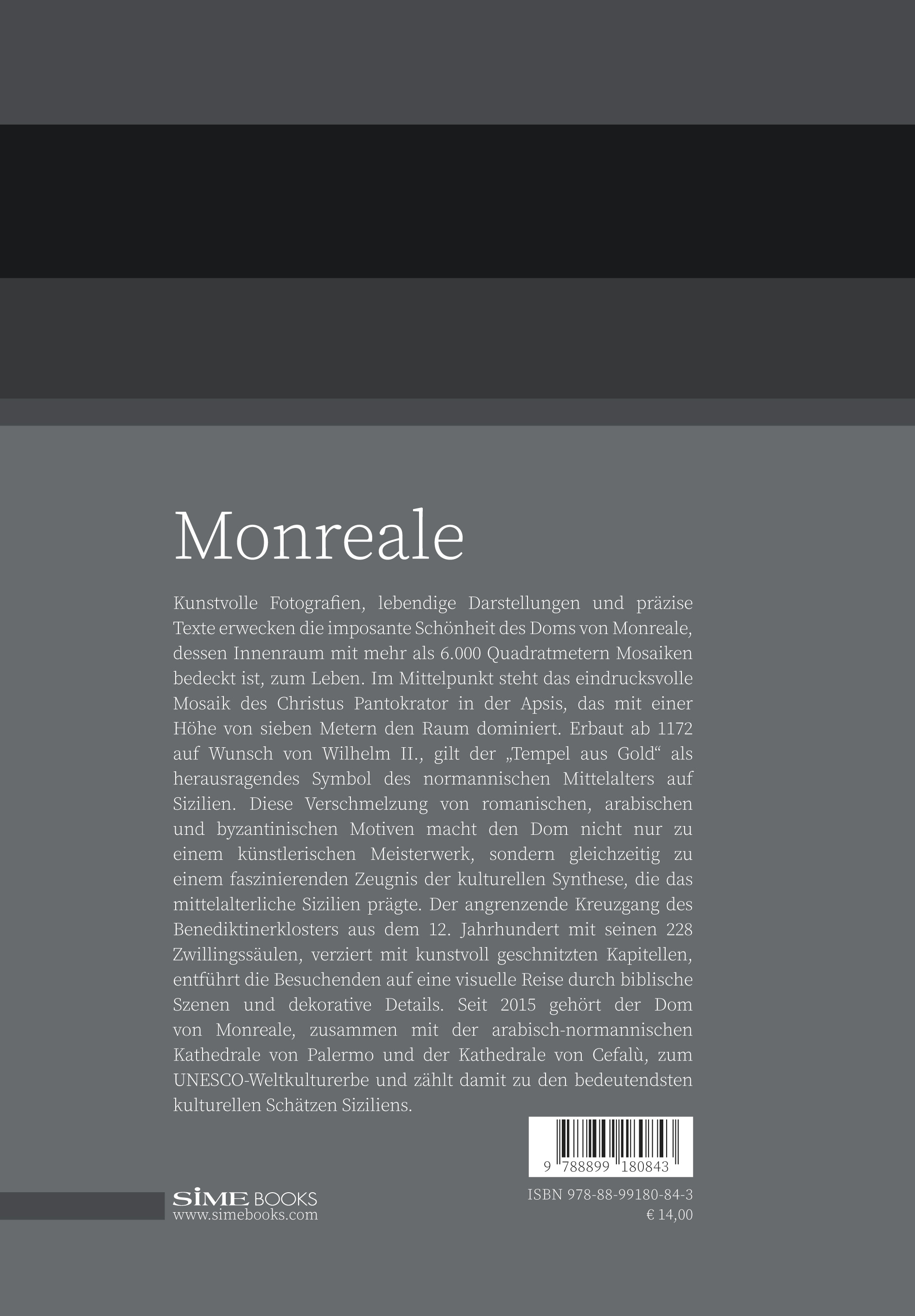 Spektakuläre Fotos, anschauliche Darstellungen und präzise Texte erschließen die wichtigsten Bildszenen des Duomo von Monreale, dessen Innenraum mit über 6.000 Quadratmetern Mosaiken bedeckt ist. Beherrscht wird er vom sieben Meter hohen Christus Pantokrator in der Apsis – einer der eindrucksvollsten Darstellungen des mittelalterlichen Christentums. Der „Goldene Tempel“, ab 1172 im Auftrag Wilhelms II. errichtet, vereint romanische, arabische und byzantinische Elemente und steht beispielhaft für die kulturelle Vielfalt des normannischen Sizilien. Neben dem Dom lädt der Benediktinerkreuzgang des 12. Jahrhunderts zu einem faszinierenden Rundgang durch biblische Szenen und ornamentale Motive ein. Seit 2015 gehört der Duomo von Monreale – zusammen mit den arabisch-normannischen Monumenten Palermos und der Kathedrale von Cefalù zum UNESCO-Weltkulturerbe.