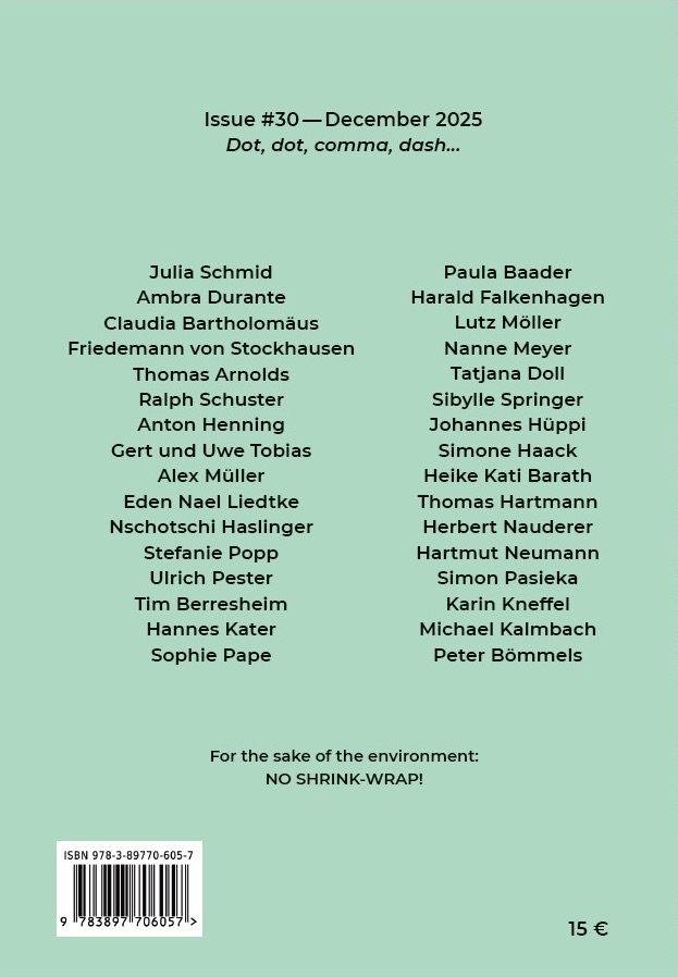 Salon No. 30 enthält eine Sammlung von Bildessays (speziell für Salon gemacht) von Julia Schmid, Ambra Durante, Claudia Bartholomäus, Friedemann von Stockhausen,