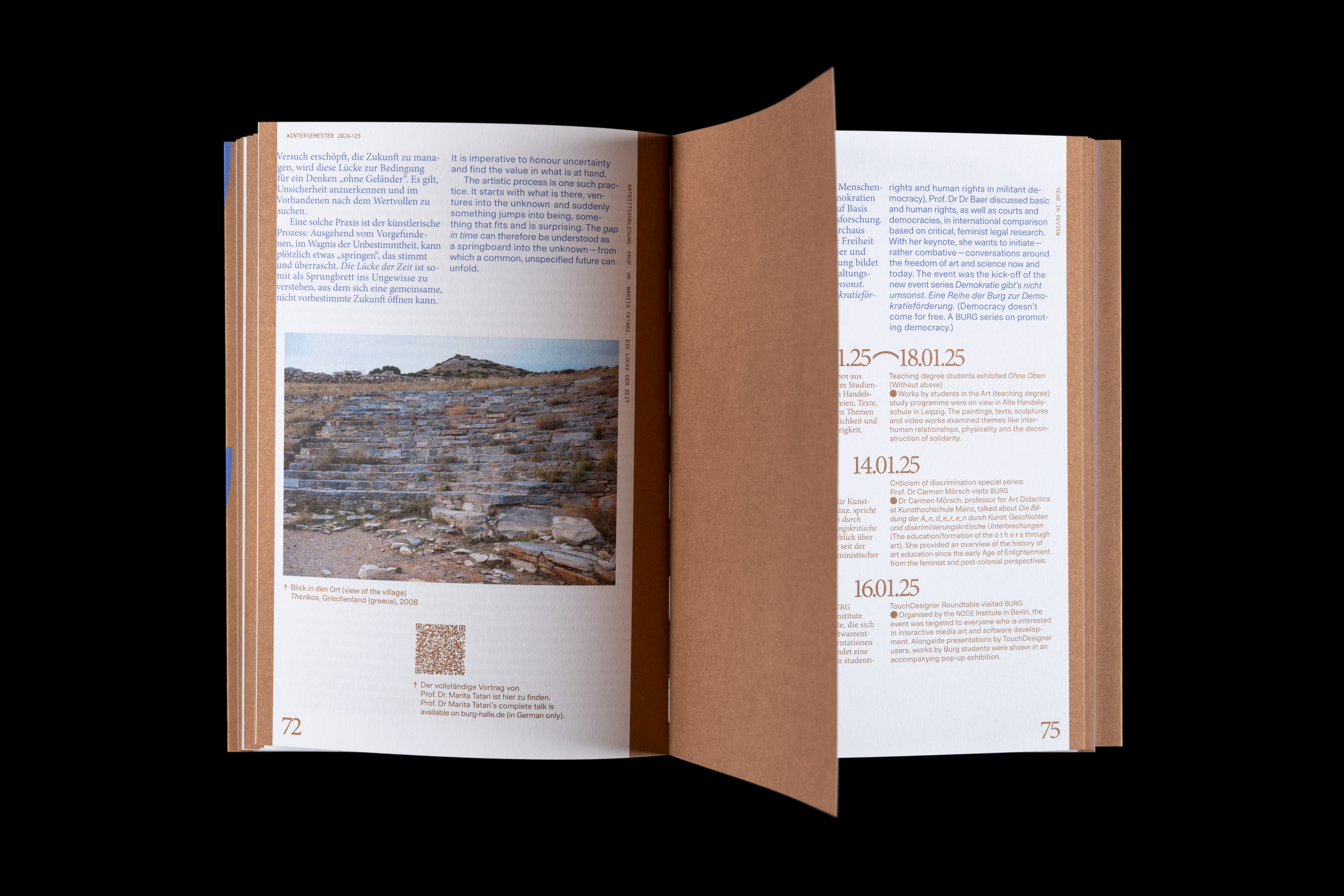 Das Jahrbuch 2024/25 der Burg Giebichenstein Kunsthochschule Halle öffnet den Blick auf zwei ereignisreiche Semester und versammelt herausragende Projekte, prägende Momente und vielstimmige Einblicke in das Hochschulleben an der BURG. Wie schon im Vorjahr folgt die Publikation dem akademischen Kalender und dokumentiert ein vollständiges Studienjahr – mit den Ereignissen, Veranstaltungen, Publikationen, Projekten, Ausstellungen und Auszeichnungen, die die Hochschule bewegt und weiterentwickelt haben. Die Vielfalt der Themen spiegelt sich zudem in vertiefenden Texten wider, die künstlerische, gestalterische und gesellschaftliche Aspekte in den Fokus rücken.
