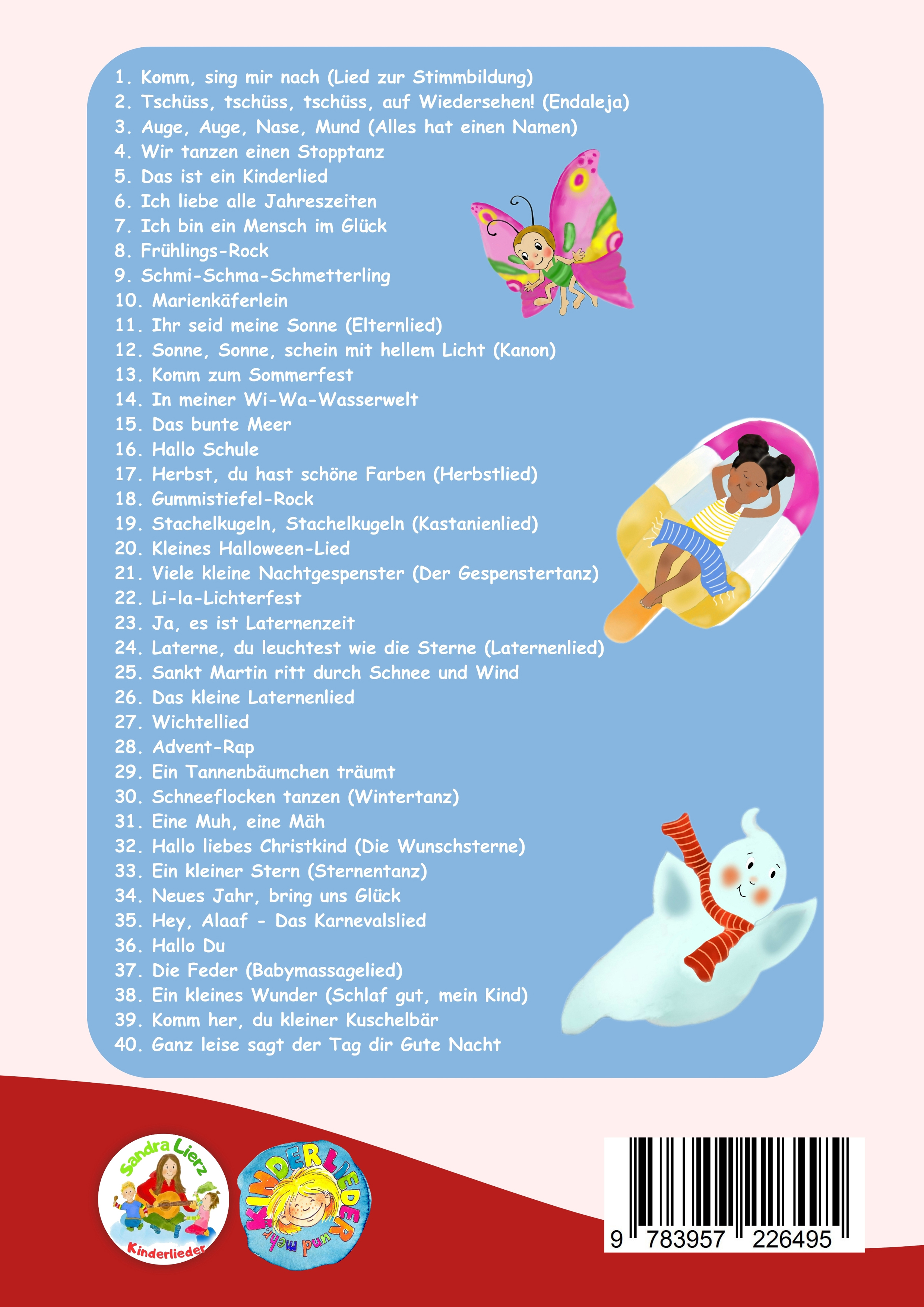 Komm, sing mir nach durchs ganze Jahr. 40 neue Kinderlieder für Krippe, Kita & Grundschule. Was erwartet dich in diesem Liederbuch?Freu dich auf 40 Kinderlieder aus unserer Sammlung, die dir ein singendes, buntes und musikalisches Jahr bescheren werden. Die Jahreszeiten und Themen sind übersichtlich strukturiert, so dass du nicht lange suchen musst. Ideal geeignet für den Einsatz in Krippen, Kitas und Grundschulen. Wir wünschen dir viel Freude beim Singen, Tanzen und Musizieren. Sandra, Stephen & RalfAlle enthaltenen Lieder: Sing mir nach durch den Tag 1. Komm, sing mir nach (Lied zur Stimmbildung) 2. Tschüss, tschüss, tschüss, auf Wiedersehen! (Endaleja) 3. Auge, Auge, Nase, Mund (Alles hat einen Namen) 4. Wir tanzen einen Stopptanz 5. Das ist ein Kinderlied 6. Ich liebe alle Jahreszeiten 7. Ich bin ein Mensch im Glück Sing mir nach durch den Frühling 8. Frühlings-Rock 9. Schmi-Schma-Schmetterling 10. Marienkäferlein 11. Ihr seid meine Sonne (Elternlied) 12. Sonne, Sonne, schein mit hellem Licht (Kanon) Sing mir nach durch den Sommer 13. Komm zum Sommerfest 14. In meiner Wi-Wa-Wasserwelt 15. Das bunte Meer 16. Hallo Schule Sing mir nach durch den Herbst 17. Herbst, du hast schöne Farben (Herbstlied) 18. Gummistiefel-Rock 19. Stachelkugeln, Stachelkugeln (Kastanienlied) 20. Kleines Halloween-Lied 21. Viele kleine Nachtgespenster (Der Gespenstertanz) 22. Li-la-Lichterfest 23. Ja, es ist Laternenzeit 24. Laterne, du leuchtest wie die Sterne (Laternenlied) 25. Sankt Martin ritt durch Schnee und Wind 26. Das kleine Laternenlied Sing mir nach durch den Winter 27. Wichtellied 28. Advent-Rap 29. Ein Tannenbäumchen träumt 30. Schneeflocken tanzen (Wintertanz) 31. Eine Muh, eine Mäh 32. Hallo liebes Christkind (Die Wunschsterne) 33. Ein kleiner Stern (Sternentanz) 34. Neues Jahr, bring uns Glück 35. Hey, Alaaf - Das Karnevalslied Sing mir nach durch ein Babyjahr 36. Hallo Du 37. Die Feder (Babymassagelied) 38. Ein kleines Wunder (Schlaf gut, mein Kind) 39. Komm her, du kleiner Kuschelbär 40. Ganz leise sagt der Tag dir Gute Nacht Die Lieder kannst Du bei allen bekannten Streamingdiensten hören!