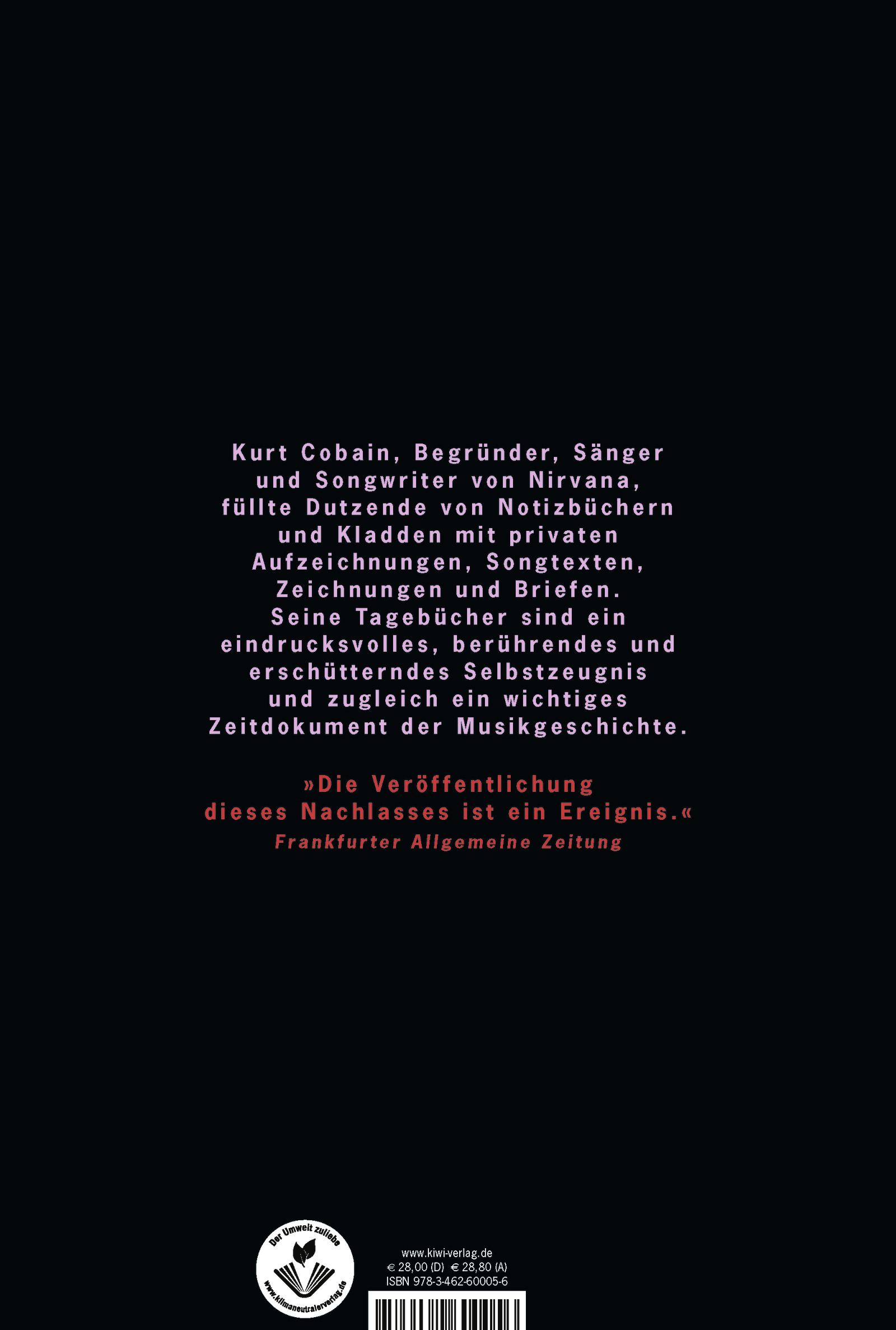 | Schlagworte | 90er Jahre • Aufzeichnungen • Cobain, Kurt • Come as you are • Gedanken • Grunge • Hardcover, Softcover / Sachbücher/Musik, Film, Theater/Biographien, Autobiograph • Innen-Welt • Künstler • Kurt Cobain • Musik • Musiker Rock/Pop/Jazz (Tagebuch); Cobain, Kurt • Musiker Rock/Pop/Jazz (Tagebücher); Cobain, Kurt • Musik-Geschichte • Nevermind • Nirvana • Notizen • Seattle • Tagebuch • Zeit-Geschichte |