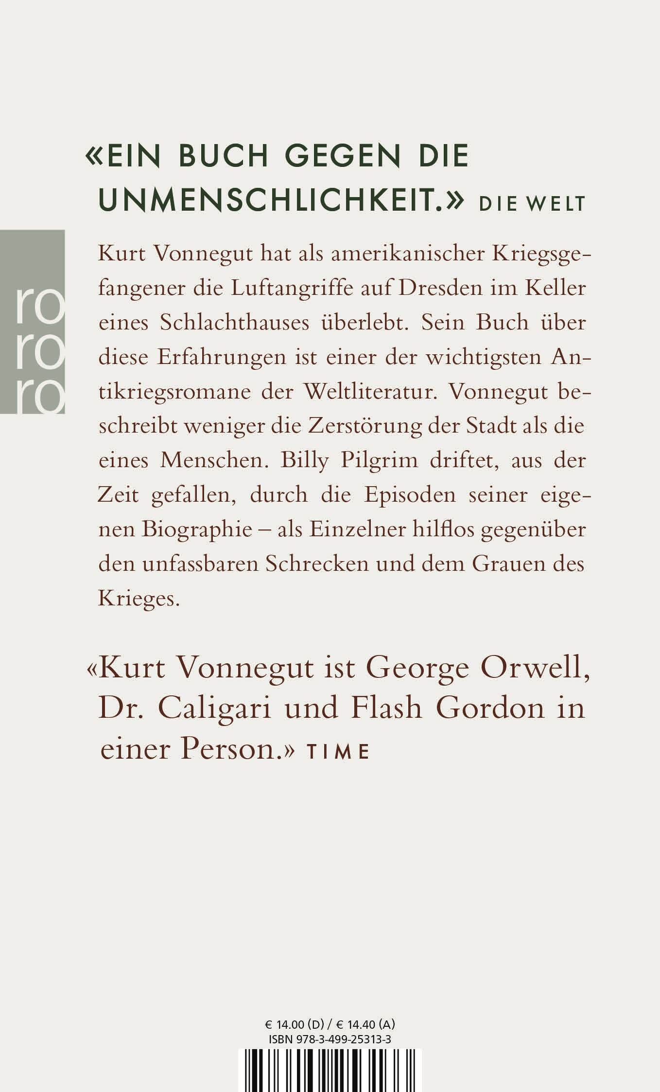 Kurt Vonnegut hat als amerikanischer Kriegsgefangener die Luftangriffe auf Dresden im Keller eines Schlachthauses überlebt. Sein Buch über diese Erfahrungen ist einer der wichtigsten Antikriegsromane der Weltliteratur. Vonnegut beschreibt weniger die Zerstörung der Stadt als die eines Menschen. Billy Pilgrim driftet, aus der Zeit gefallen, durch die Episoden seiner eigenen Biographie - als Einzelner hilflos gegenüber den unfassbaren Schrecken und dem Grauen des Krieges.