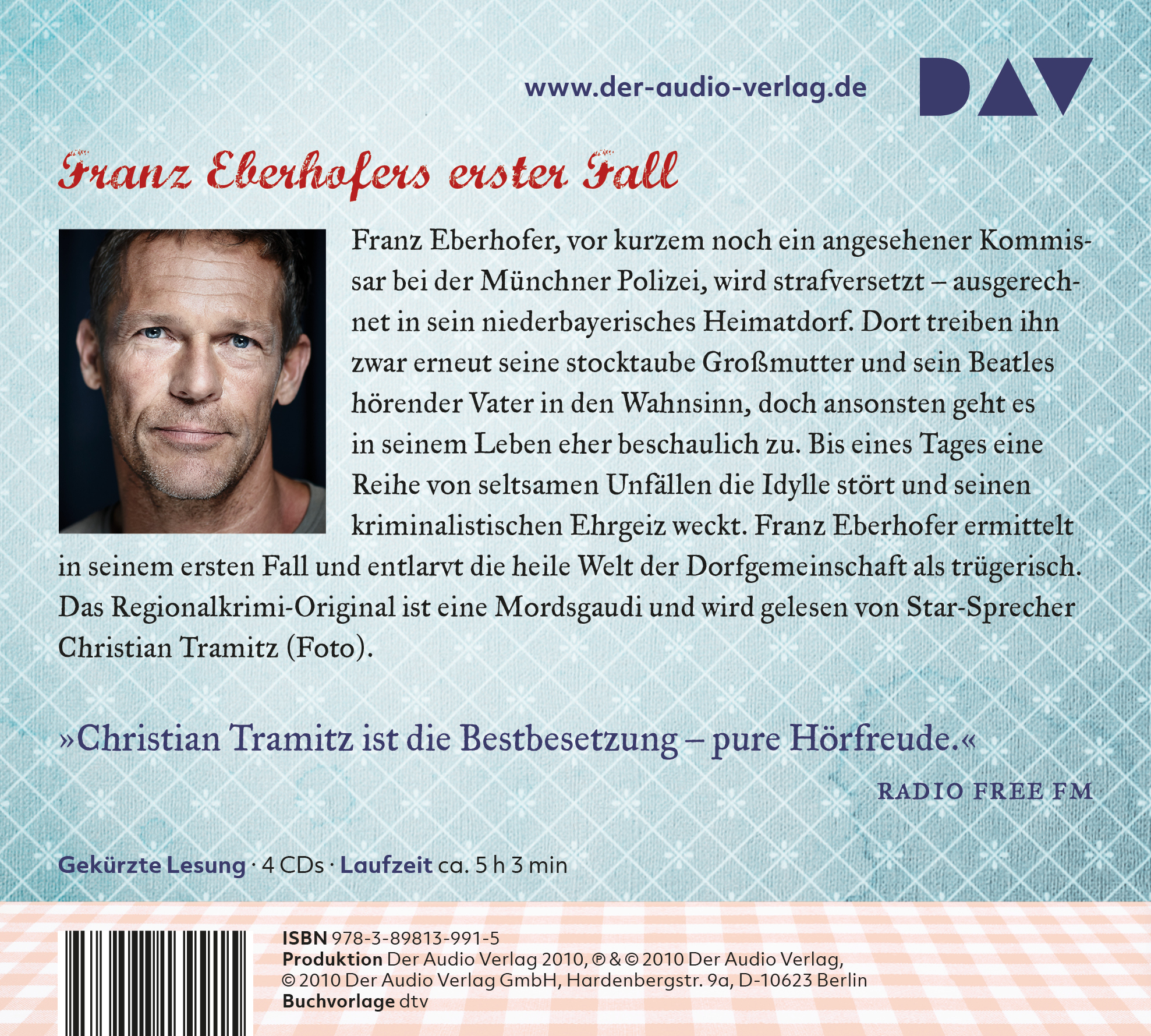 Christian Tramitz, geboren in München, spielte mit Bully Herbig in der preisgekrönten »Bullyparade« und erreichte mit seiner Rolle des Rangers in »Der Schuh des Manitu« Kultstatus. Er ist regelmäßig im Fernsehen zu sehen, beispielsweise in der beliebten ARD-Krimiserie »Hubert ohne Staller«. Christian Tramitz liest für DAV und eine riesige Fangemeinde alle Teile der Hörbuch-Reihe um Franz Eberhofer ein.